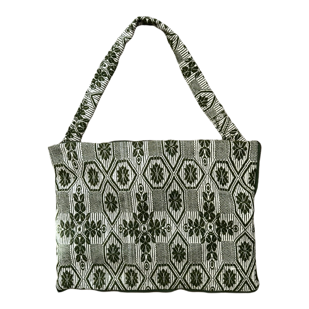 Yeşil ve krem tonlarında iç içe geçen floral ve baklava motifleri, yüzeyde çarpıcı bir simetri oluşturur. Kumaşın sağlam dokusu ile detaylı işçilik, çantaya hem estetik hem de uzun ömürlü kullanım kazandırır. Yeşil bir fermuar ile tamamlanan tasarım zarif bir kontrast sunar.