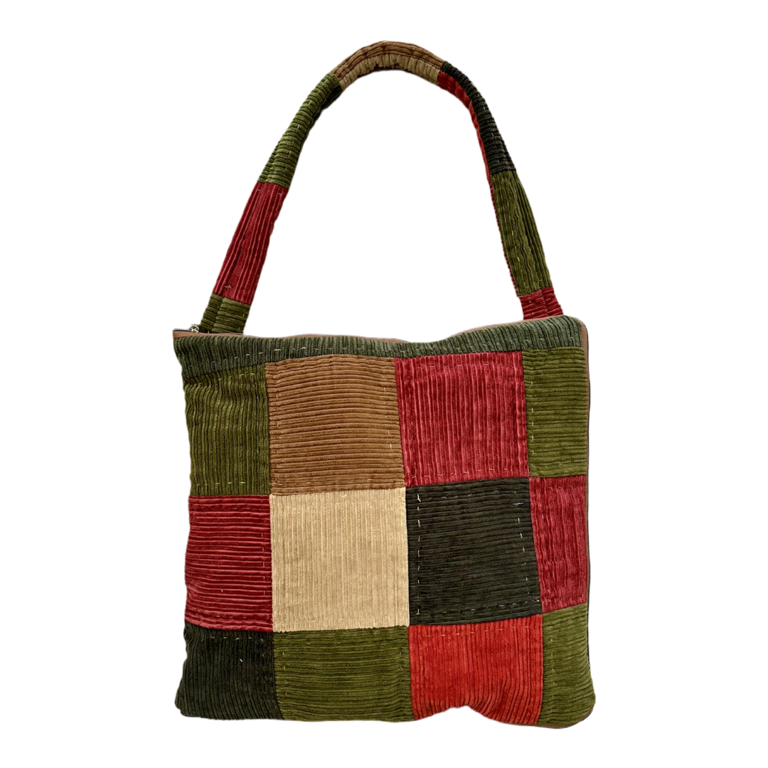 Her parça, dünyanın dört bir yanından özenle temin edilen vintage kumaşlardan titizlikle üretilir ve her biri kendine has renk, doku ve anlatım taşır. Fitilli kadifenin ışığı yakalama biçimi ve panel kombinleri, rustik ve mirasa köklenen estetiği dengeler. Kahverengi fermuar detaylarıyla işlevsellik ve görsel bütünlük sağlanmıştır.