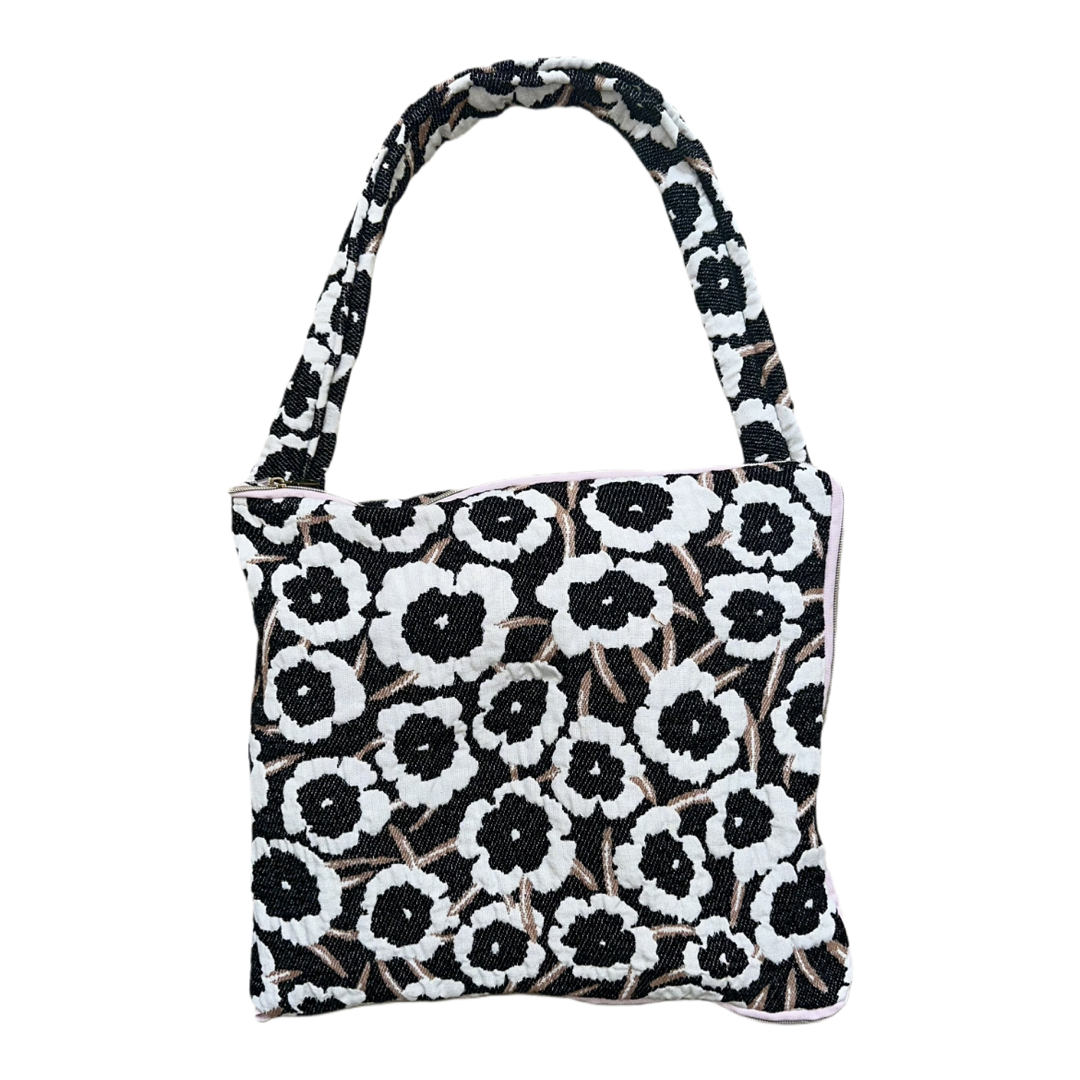 İncelikli floral jakar dokuma, parçaya hem doku hem de derinlik katarak sanatsal bir ifade oluşturur. Krem zemin üzerindeki pudramsı pembelik ve siyah-beyaz çiçek motifleri dengeli, zarif bir kontrast sağlar. Açık pembe fermuar gibi küçük detaylar tasarıma karakter katar.