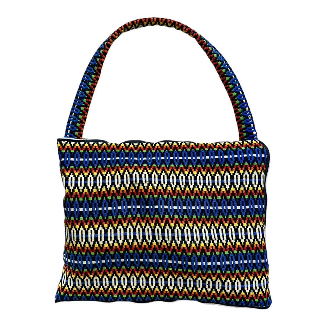Kırmızı, yeşil, mavi ve altın sarısı paneller ritmik ve cesur bir geometri oluşturacak şekilde bir araya getirilmiştir. Orta ağırlıkta kapitone yapısı, parçanın bir sanat eseri ağırlığını korurken mobil kullanım için uyum sağlar; siyah fermuarla tamamlanmıştır.