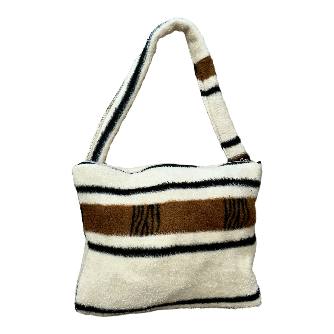 Vintage fırçalanmış örgü kumaştan üretilmiş bu trenç çanta, krem, siyah ve altın kahverengisi tonlarında cesur çizgiler ve hayvansı desenler taşır. Koleksiyonumuzun, dünya çapından özenle temin edilmiş vintage materyallerle hazırlanan seri çalışmasının bir parçasıdır.