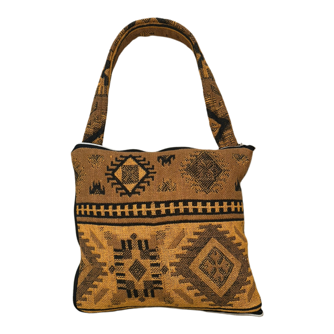 Vintage jakar kumaştan üretilmiş bu palto, soluk siyah zemin üzerinde hardal altını tonlarındaki geometrik motiflerle dikkat çeker. Coat N Tote tasarım yaklaşımıyla üretilen parça, hem giysi hem de ifade nesnesi olarak tasarlanmıştır.