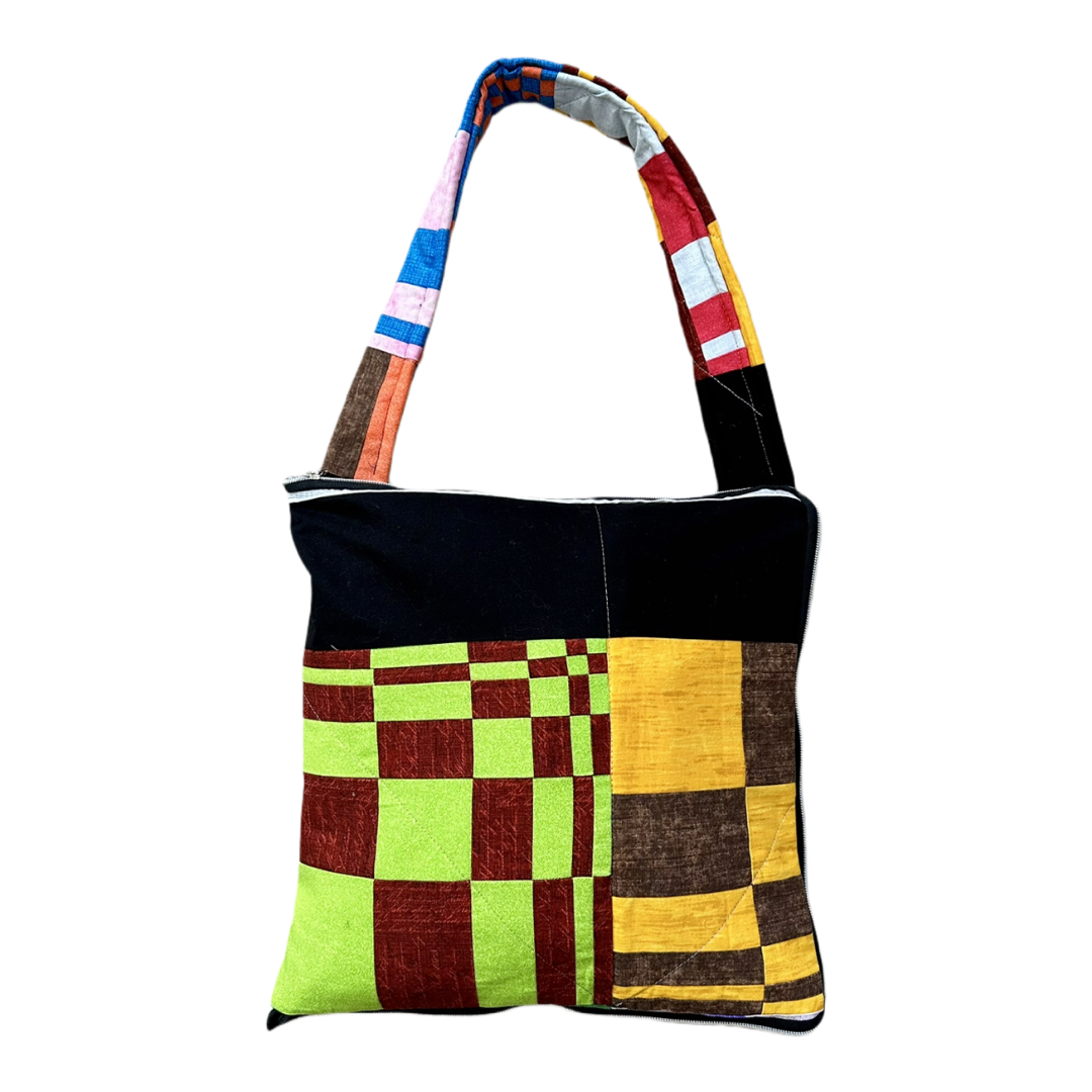 Keskin geometrik ızgaralarda birleşen kırmızılar, yeşiller, morlar, maviler ve turuncular koyu zeminin dengesiyle estetik bir kontrast oluşturur. Her bölüm özenle işlenmiş ve siyah fermuar gibi sade detaylarla tamamlanmıştır. Vintage malzemelerin doğasından kaynaklanan ince renk ve doku farklılıkları her parçayı eşsiz kılar.