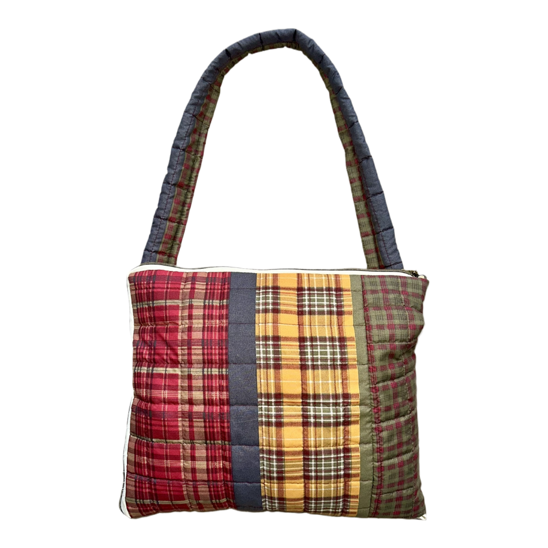 Koyu kırmızılar, hardal sarıları, orman yeşilleri ve denim mavilerinden oluşan ekose patchwork düzeni, geleneğe bağlı bir his ile modern bir keskinliği dengeler. Kapitoneli yapı ve titizlikle seçilmiş vintage kumaşlar, her parçaya özgün bir doku ve geçmişten gelen bir karakter kazandırır. Krem renkli fermuar, tasarıma ince bir kontrast ve tamamlayıcı bir dokunuş ekler.