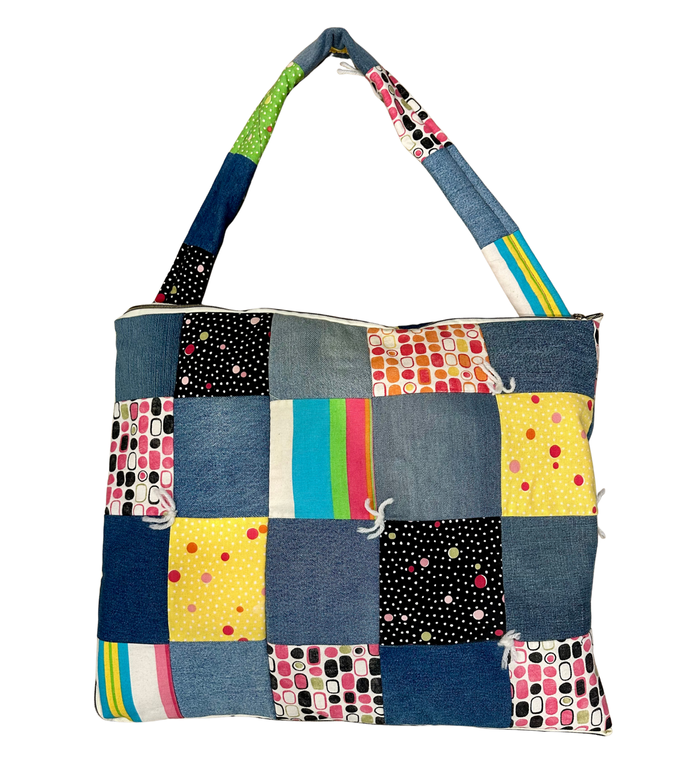 Denim kareler, puantiyeli baskılar, parlak çizgiler ve retro motiflerin uyumuyla oluşturulmuş mozaik bir düzen sağlar ve kompozisyona yıpranmışlık hissi katar. Krem rengi fermuar ve dikkatle seçilmiş vintage parçalar, tasarımın nostaljik ve neşeli ruhunu vurgular. Her ürünün renk, doku ve baskı yerleşiminde ince farklılıklar olabilir; bu farklılıklar giysinin karakterinin parçasıdır.