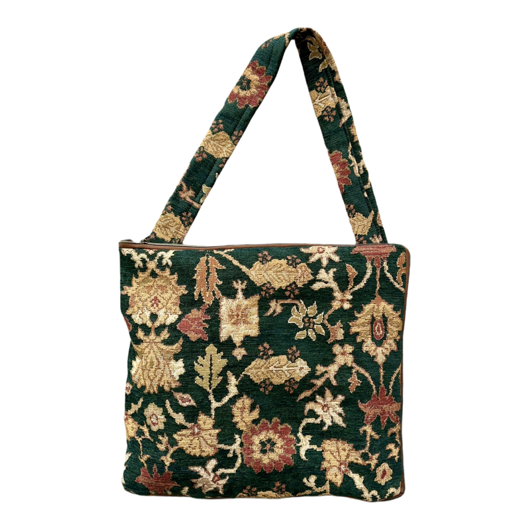 - Derin orman yeşili zemin üzerinde sarı, tuğla kırmızısı ve sıcak kahverengi tonlarında özenle işlenmiş çiçek motiflerine sahiptir.
