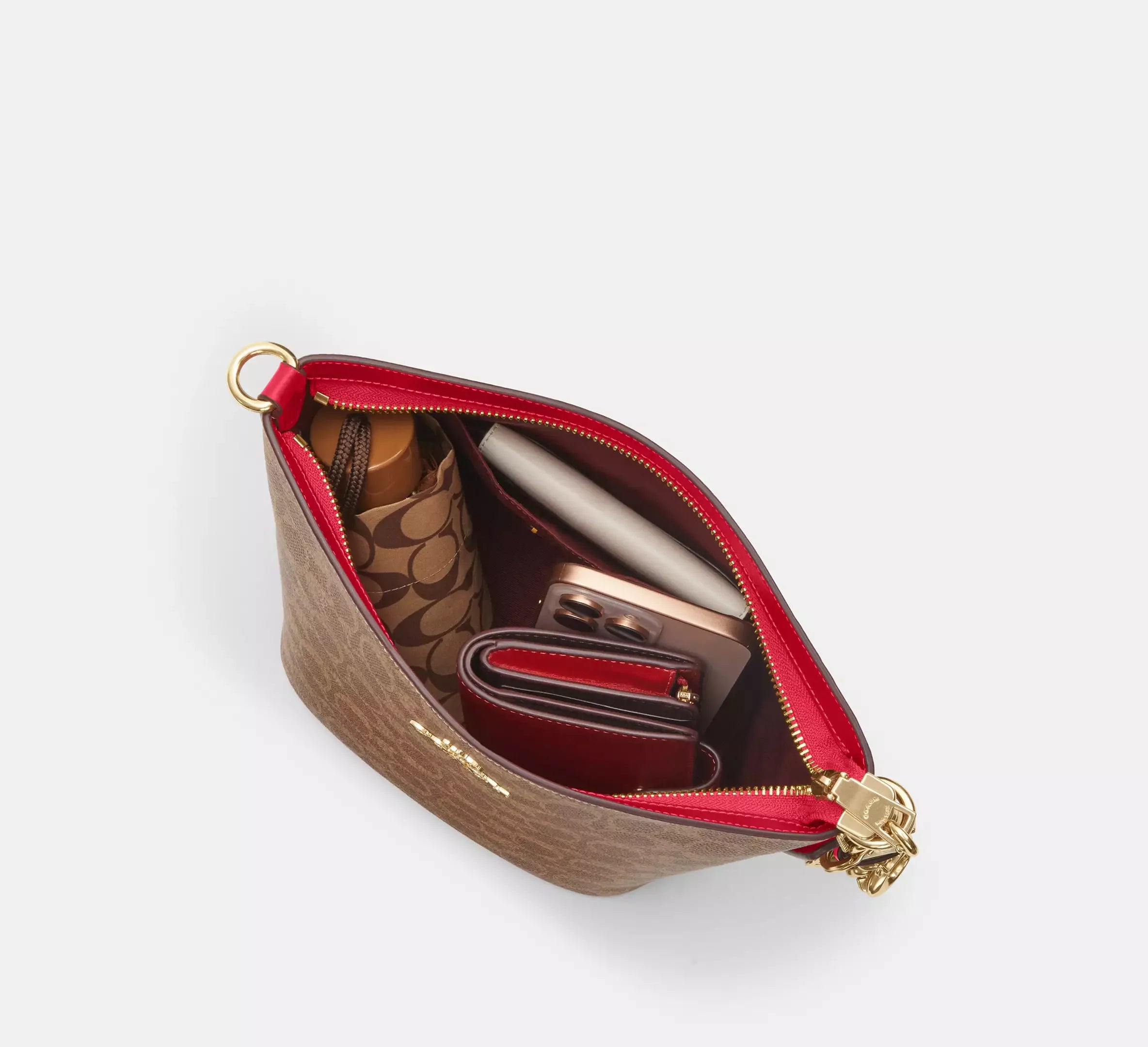 Bu çanta, imza desenli kaplamalı kanvas ve pürüzsüz deri ile özenle tasarlanmıştır. Kumaş astarı, hem estetik hem de işlevsellik açısından mükemmel bir denge sağlar.