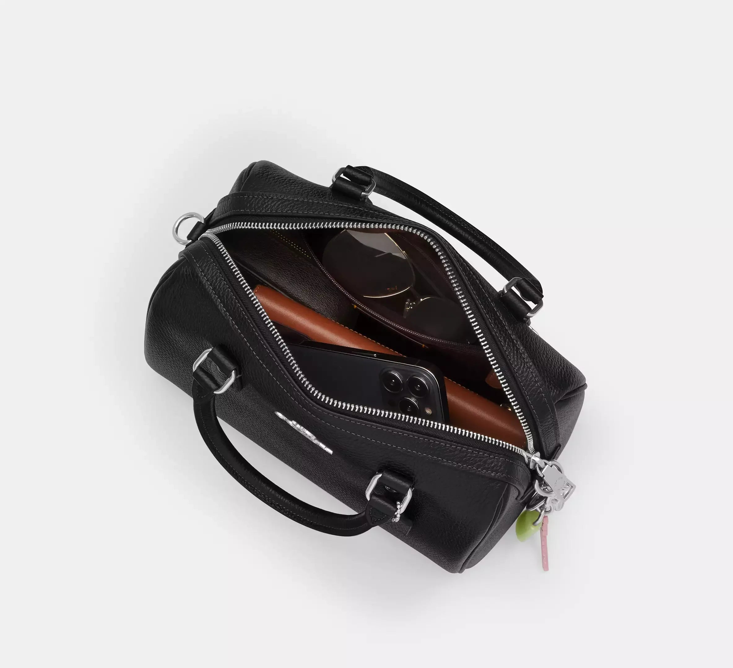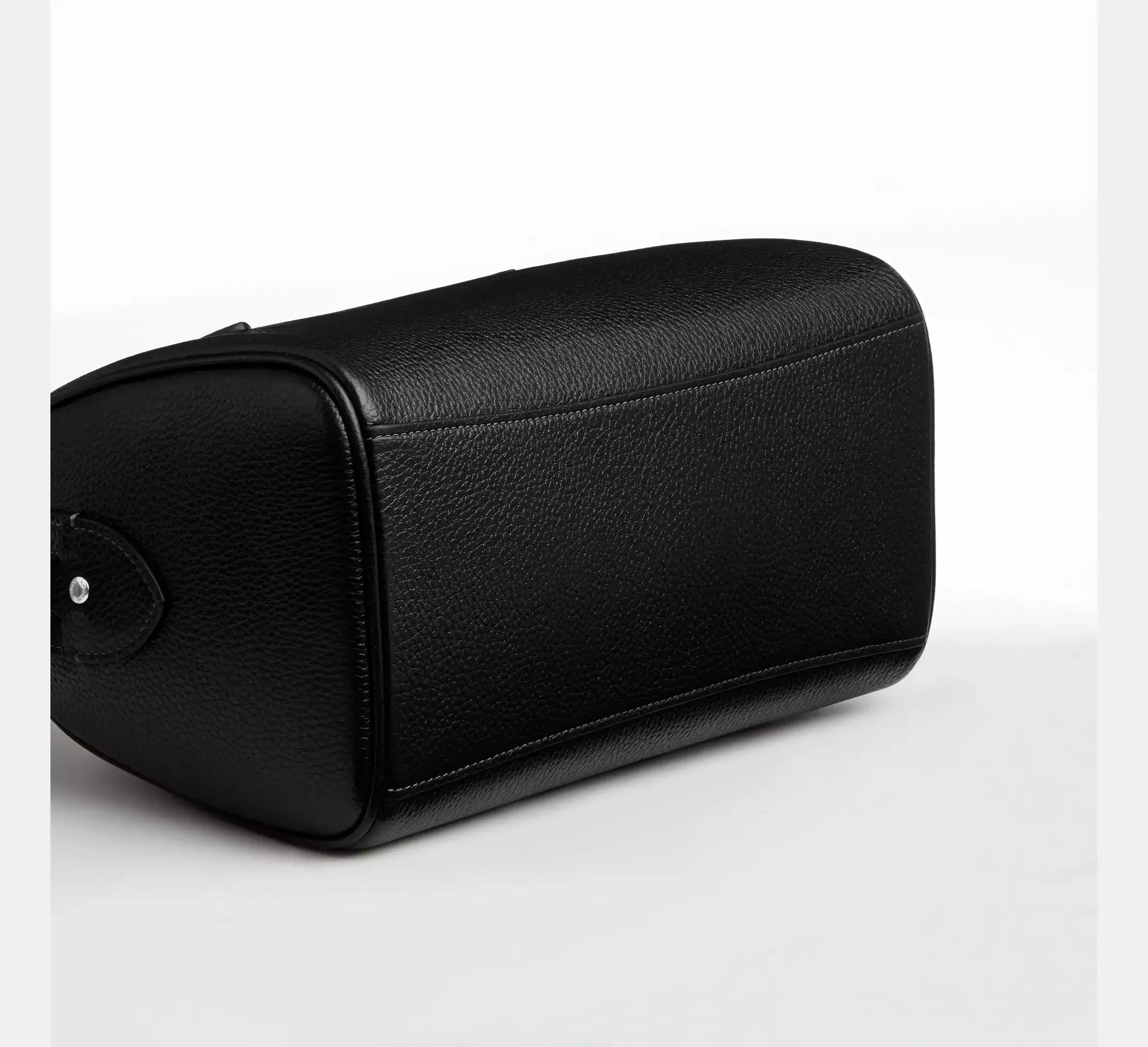 Bu çanta, rafine çakıl derisi ile özenle işlenmiş bir tasarıma sahiptir. Kumaş astarı, iç mekanın zarafetini artırırken, detaylardaki ustalık çantanın estetik dengesini tamamlıyor.