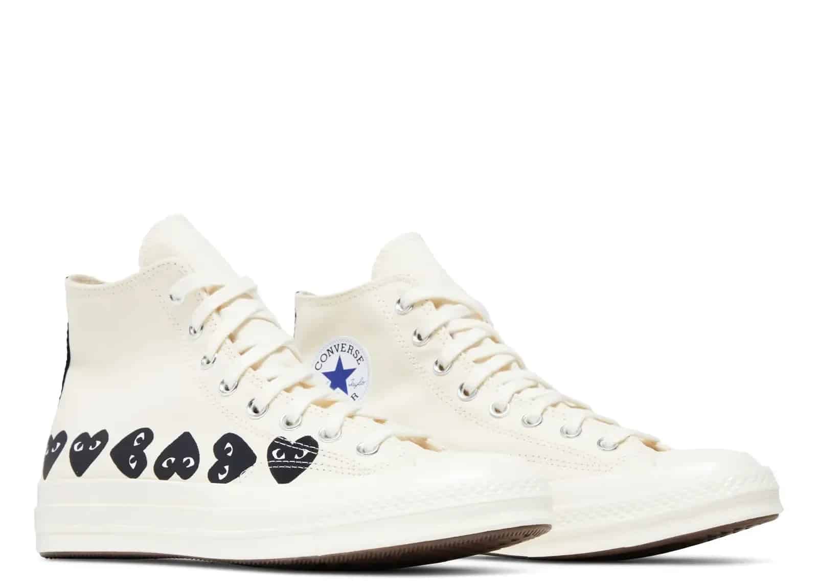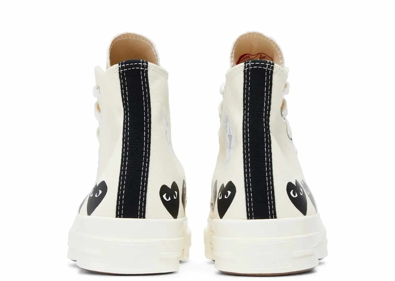 Converse, Sneaker Baker'da bulunan Converse Chuck Taylor All Star 70 Hi Comme des Garcons PLAY Multi-Heart Milk modeliyle koleksiyonuna yeni bir parça ekliyor. Bu özel tasarım, MILK/BLACK/EGRET tonlarında ve A08148C ürün koduyla sınırlı sayıda üretilmiştir.