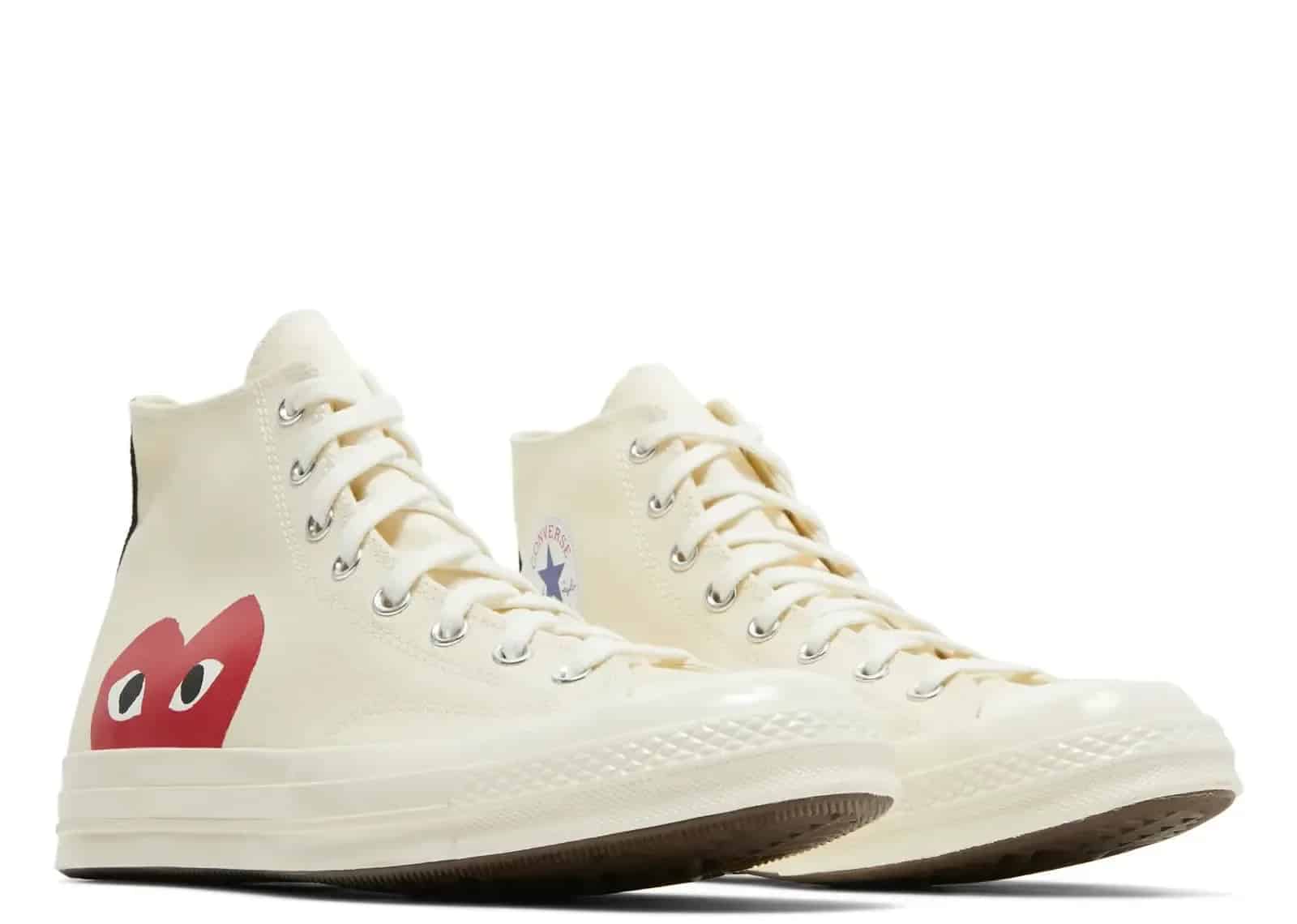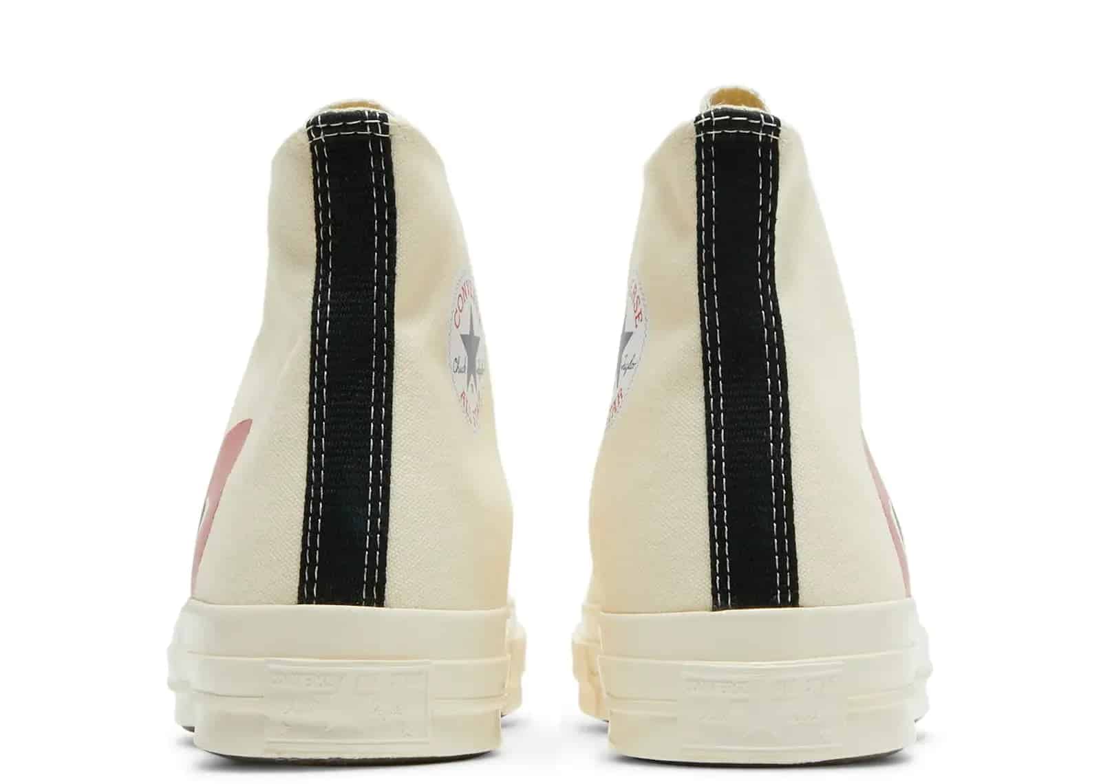 Converse Chuck Taylor All Star 70s Hi Comme des Garcons PLAY White, çift dikişli yapısı ve parlak metal delikleri ile dikkat çekmektedir. Yan duvarda yer alan kalp simgeleri, estetik bir denge sağlayarak tasarıma zarif bir dokunuş ekler.