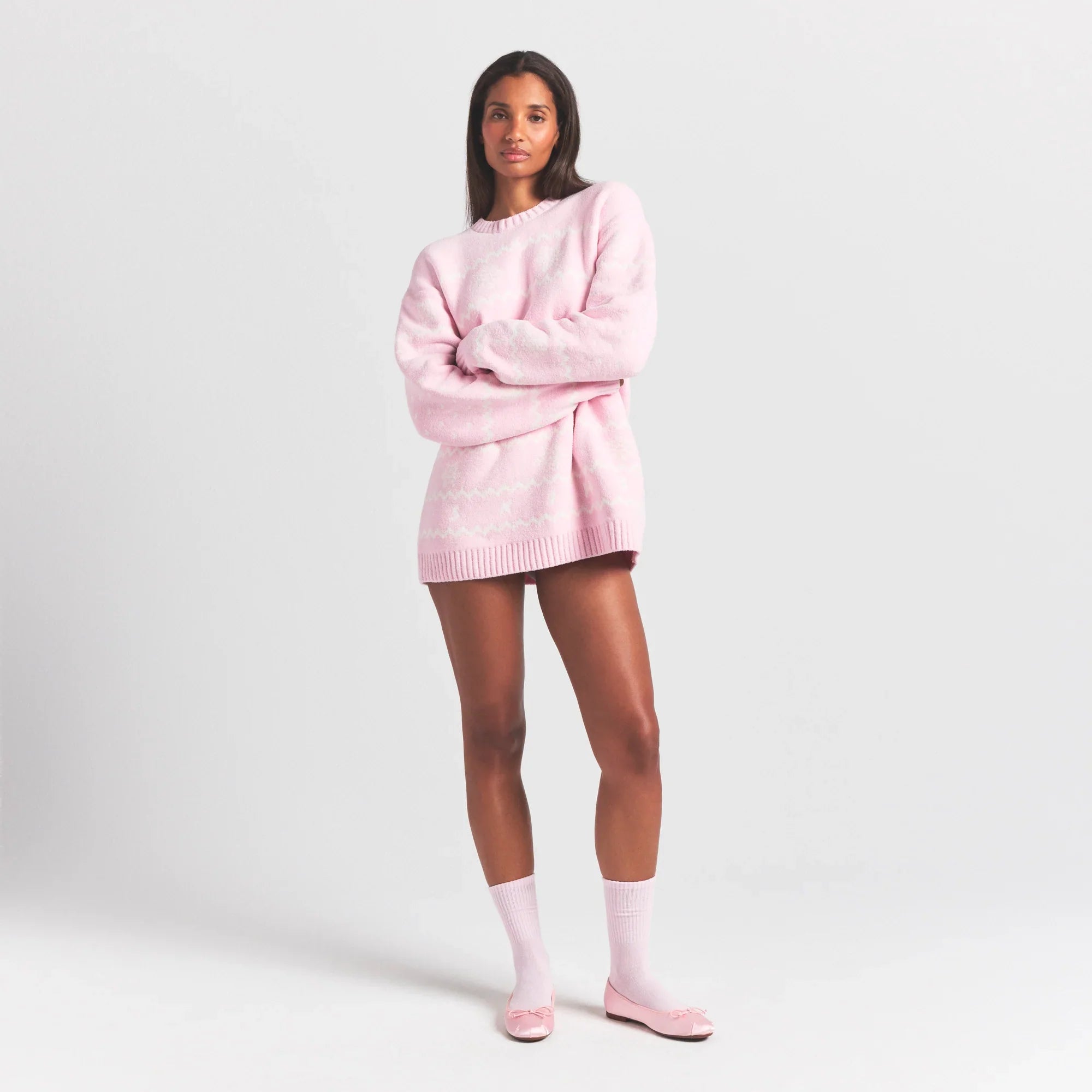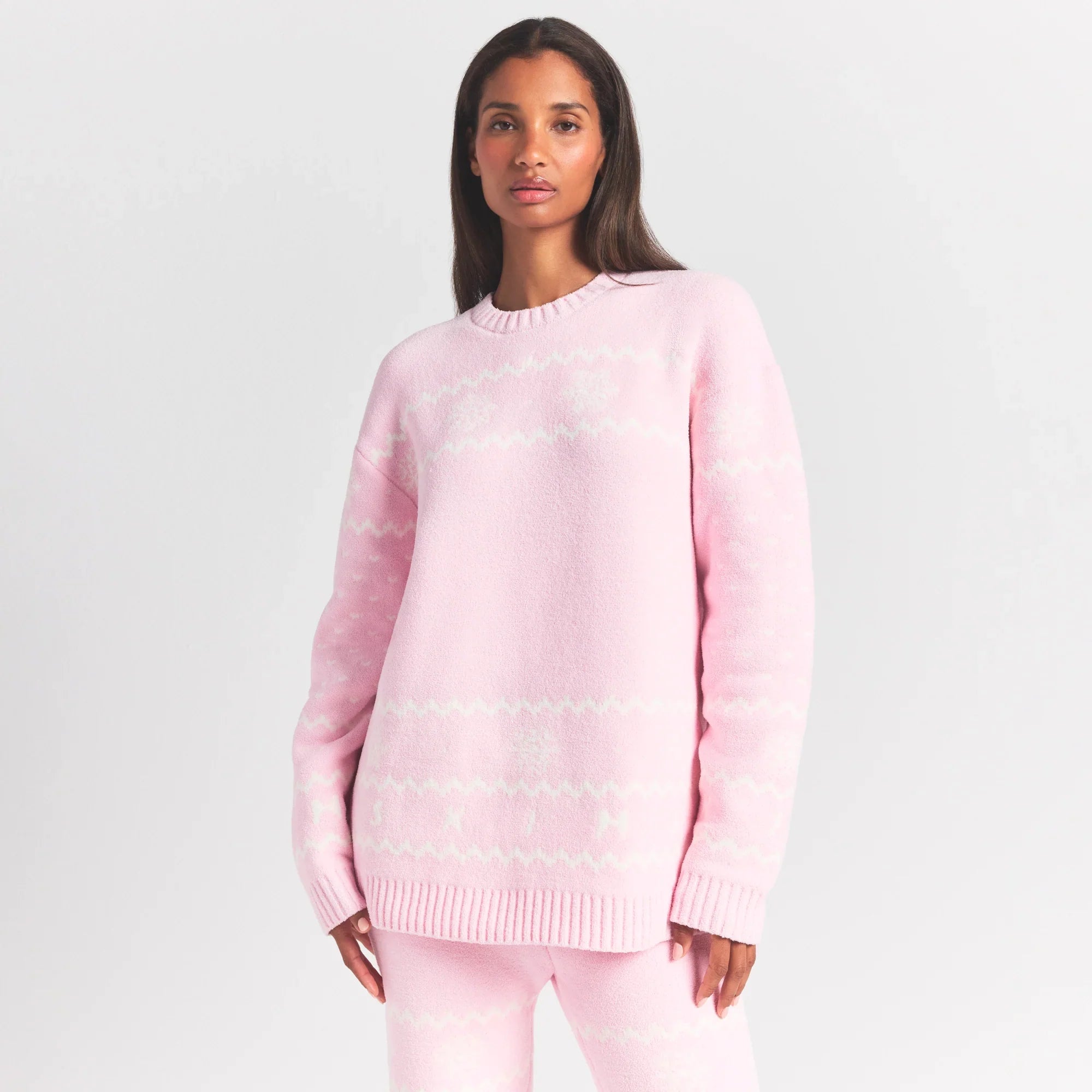 SKIMS COZY LIGHT CREWNECK PULLOVER | BABY PINK HEART FAIR ISLE