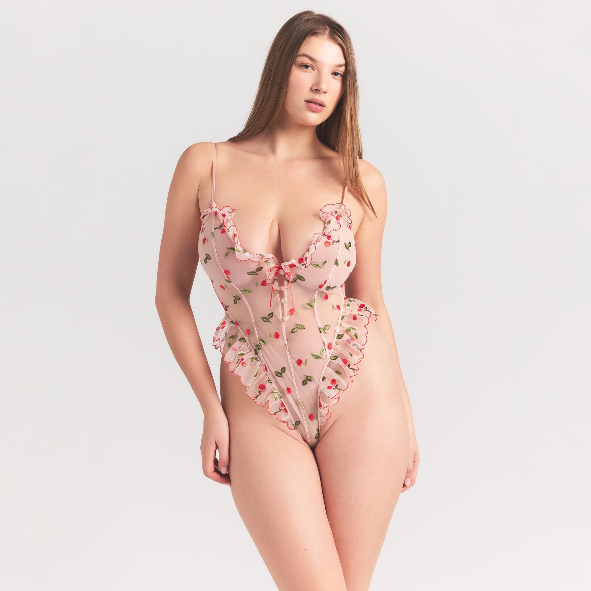 SKIMS EMBROIDERED TULLE GARTER TEDDY | PRIMROSE CHERRY TULLE