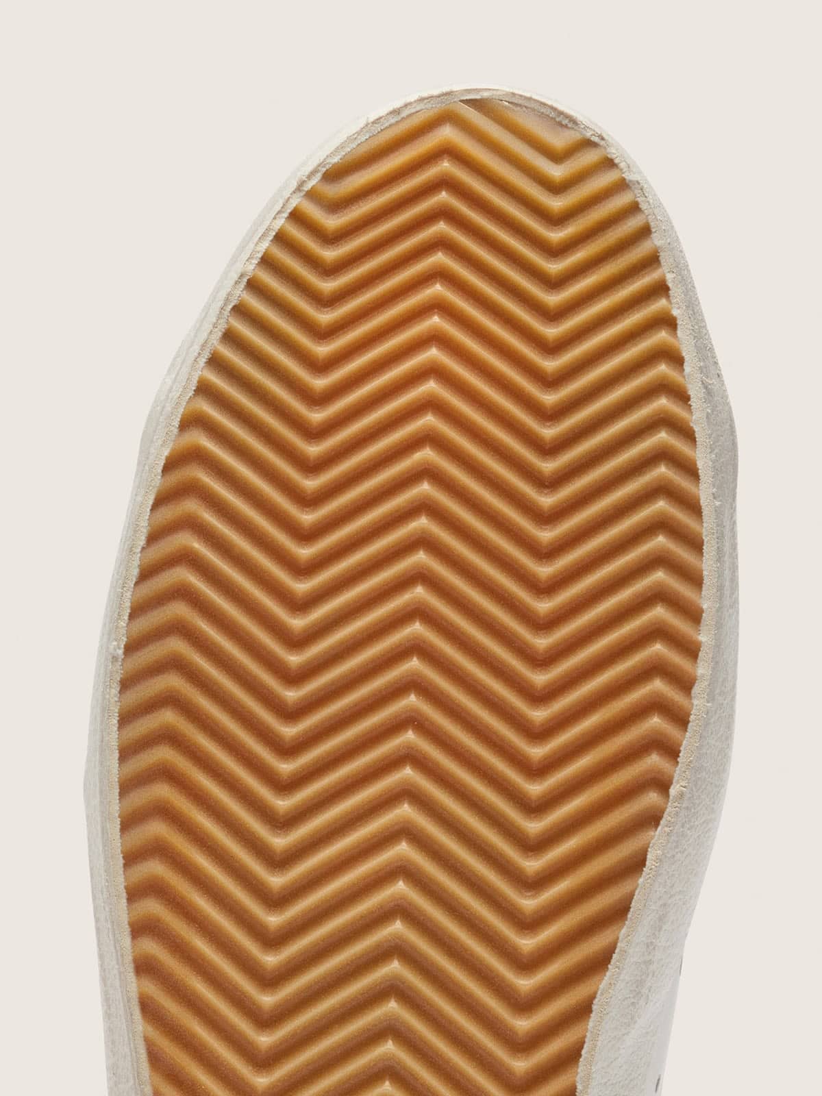 Üst kısmında 97% dana derisi ve 3% pamuk karışımı kullanılan model, mat ve aşınmış görünümlü vintage finisajla tamamlanır. Buz-gri süet dil, zeytin-yeşili kanvas yıldız ve taba deri topuk parçaları estetik bir kontrast oluşturur. Siyah bağcıklar üzerindeki zıt logolu detaylar, tasarıma ince bir karakter katar.