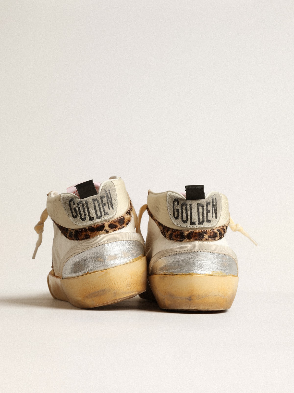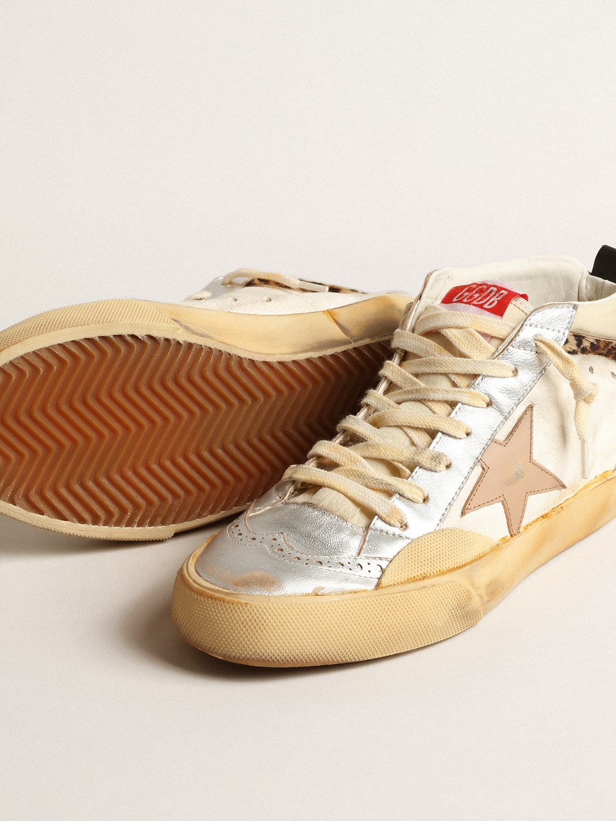 Üst kısımda white nappa deri ve naylon, old rose deri yıldız, dove-gray süet topuk detayları ve beige-brown leopard-print pony skin flash bulunur; ayrıca silver metalik deri insertleri ve broguing detayı mevcuttur. İç astar ve taban malzemelerinin özenli seçimi ile vintage finisajı birleştiren el işçiliği, ürüne sofistike ve dayanıklı bir estetik kazandırır.