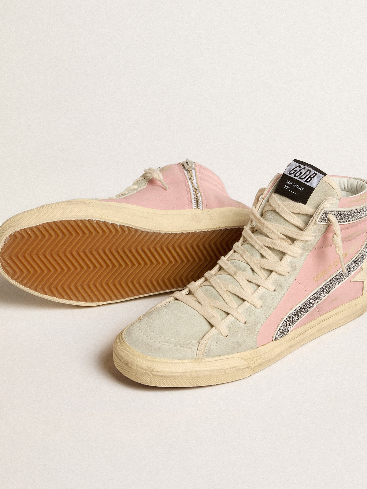 Üst yüzeyde pembe deri ile krem deri yıldızın kontrastı ve buz grisi süet topuk, dil ve ek parçalar estetik bir denge oluşturur. Silver Swarovski mikro-kristal şerit ve beyaz deri kenar trim detayları ürüne sofistike bir parlaklık katar. Vintage bitişli tasarım, zamansız bir görünüm sunarken el işçiliği her parçanın titizlikle bir araya getirildiğini gösterir.