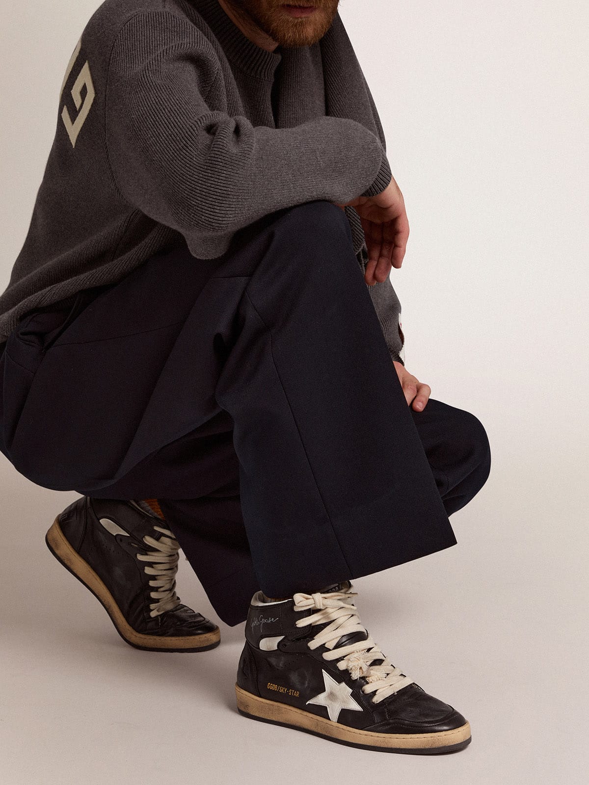Derin siyah nappa üst yüzeyi, beyaz deri yıldız detayı ve beyaz deri topuk sekmesiyle kontrast oluşturarak sofistike bir görünüm yaratır. Off-white bağcıklar ve vintage finisaj, modele karakter katar; %100 kuzu derisi üst, kaliteli deri-kumaş astar ve dayanıklı kauçuk taban ile işçilik ön plandadır. Tüm üretim el işi olarak İtalya'da gerçekleştirilir.