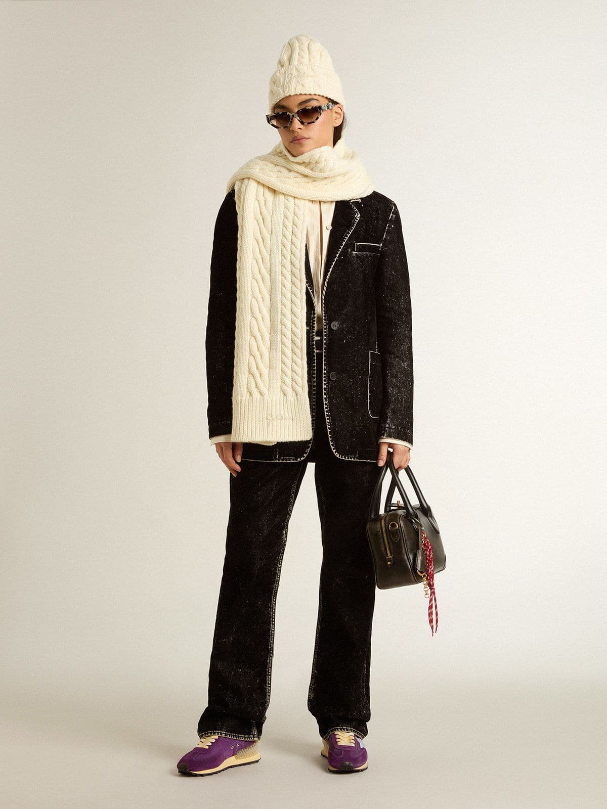 - Mor naylon üst yüzey, mor süet insertler, beyaz yıldız, gümüş folyo deri topuk detayı ve "worn-white" bağcıklar ile vintage finish