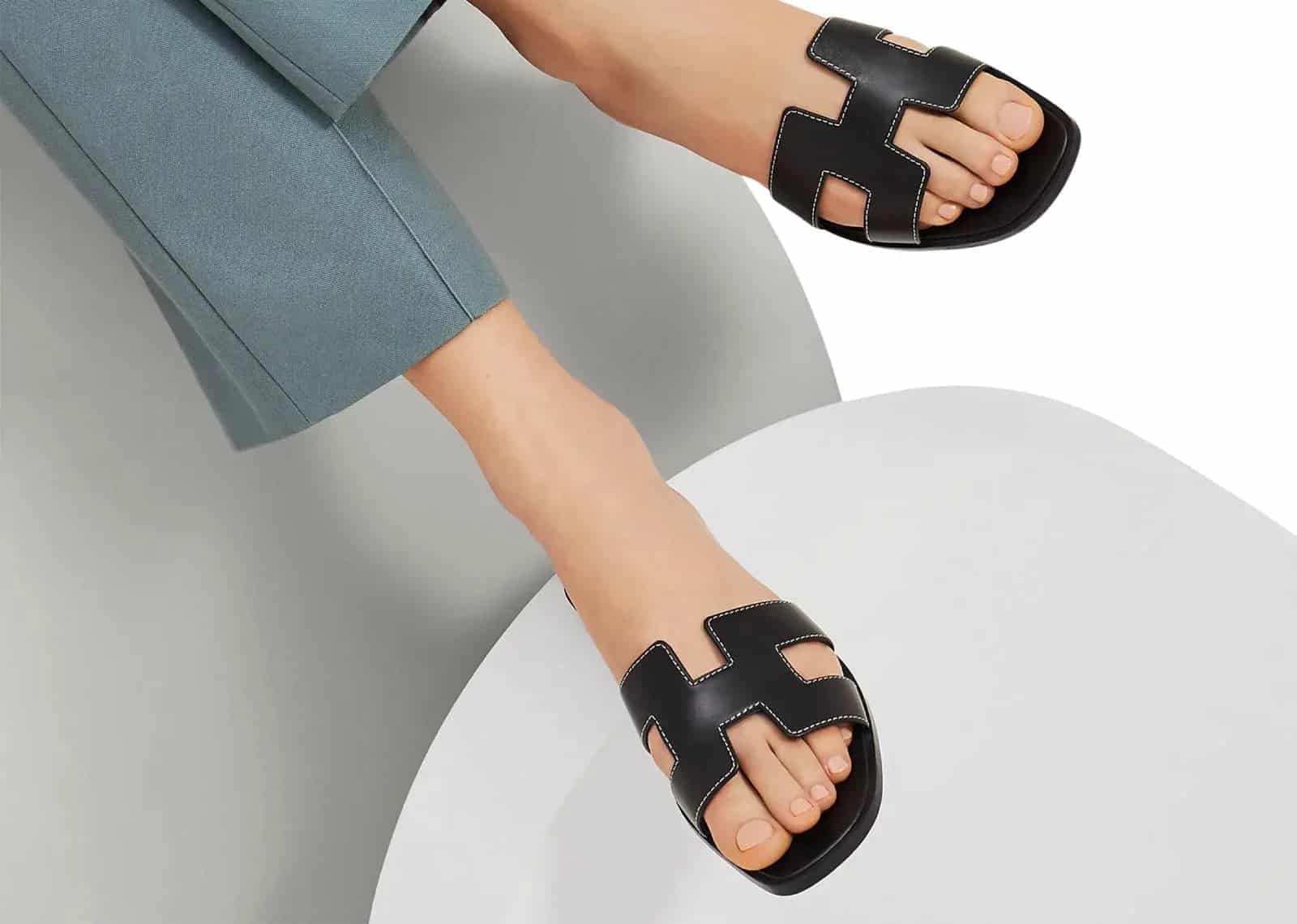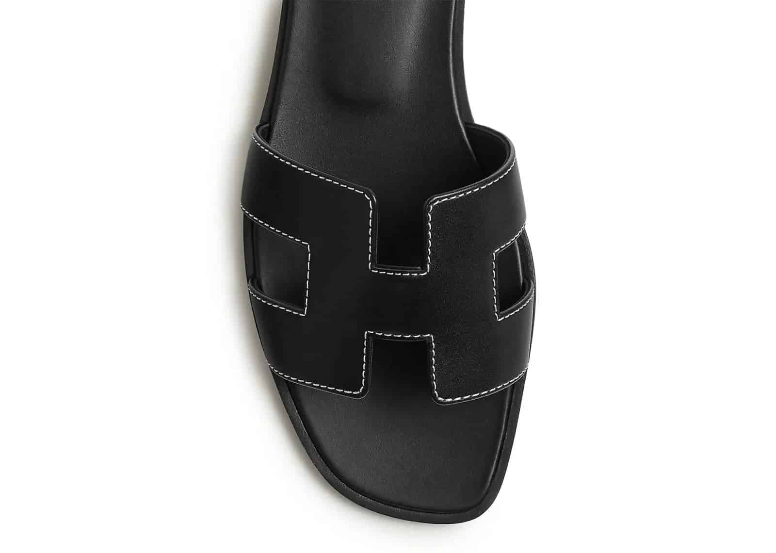 Hermès Oran Sandal, Pierre Hardy tarafından 1997 yılında tasarlanmış olup, karakteristik “H” kesimi ile dikkat çeker. Siyah deri üst kısmı, siyah deri astar ve taban ile birleşerek klasik bir şıklık oluşturur. Her sezon farklı materyal ve renklerle yeniden yorumlanan bu model, zamansız bir stil ifadesi sunar.