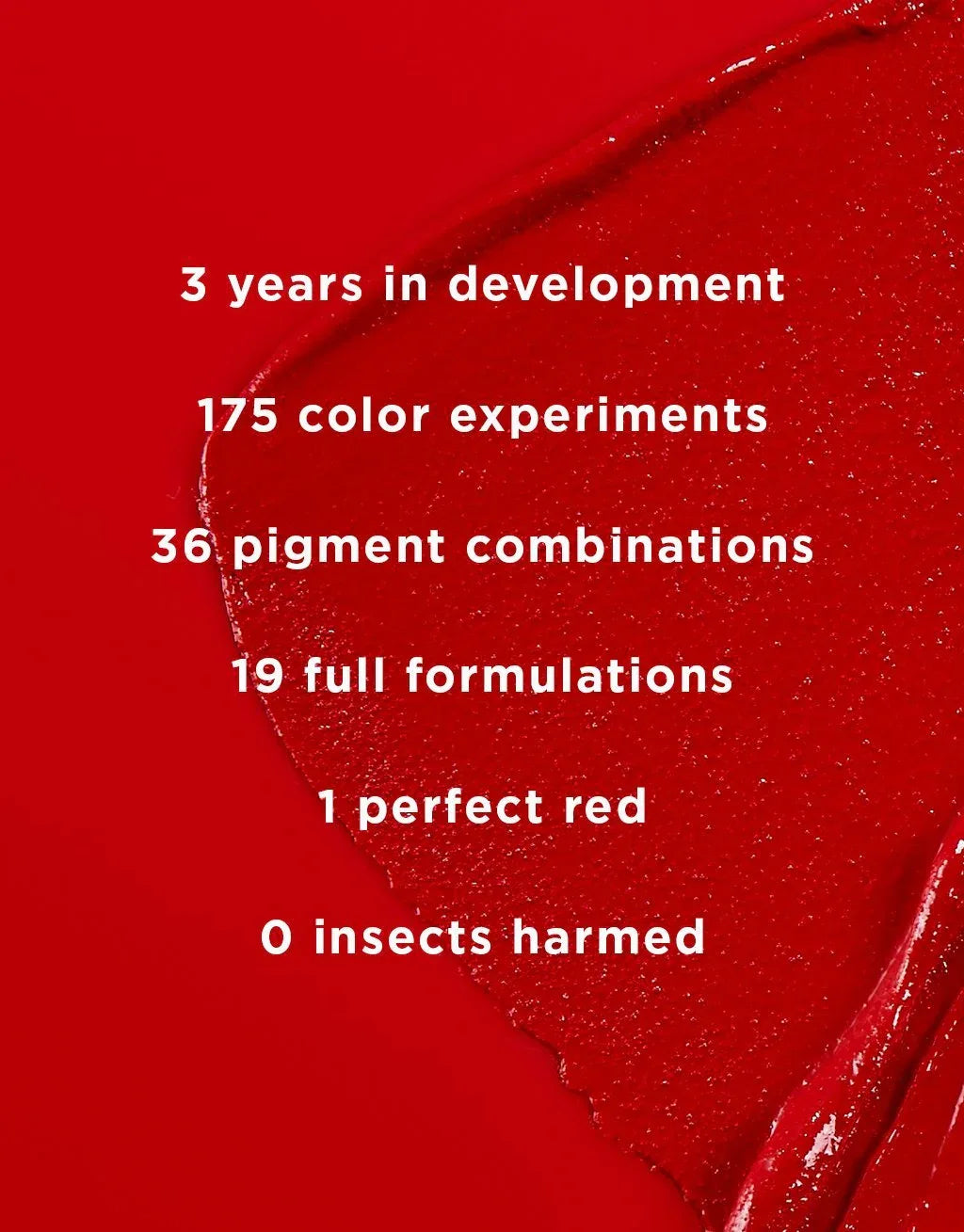 %100 vegan kırmızı ruj, carmine yerine kullanılan özel bileşenimizle formüle edilmiştir—bu, kırmızı pigmenti elde etmek için ezilen dişi böceklerden üretilen endüstri standardı pigmentin yerine geçer. Bu ödüllü ton, performanstan ödün vermeyen hayvan dostu pigmentlerle, Red 0 yenilikçi bileşiğini kullanarak doygun, gerçek kırmızı bir renk sunar.