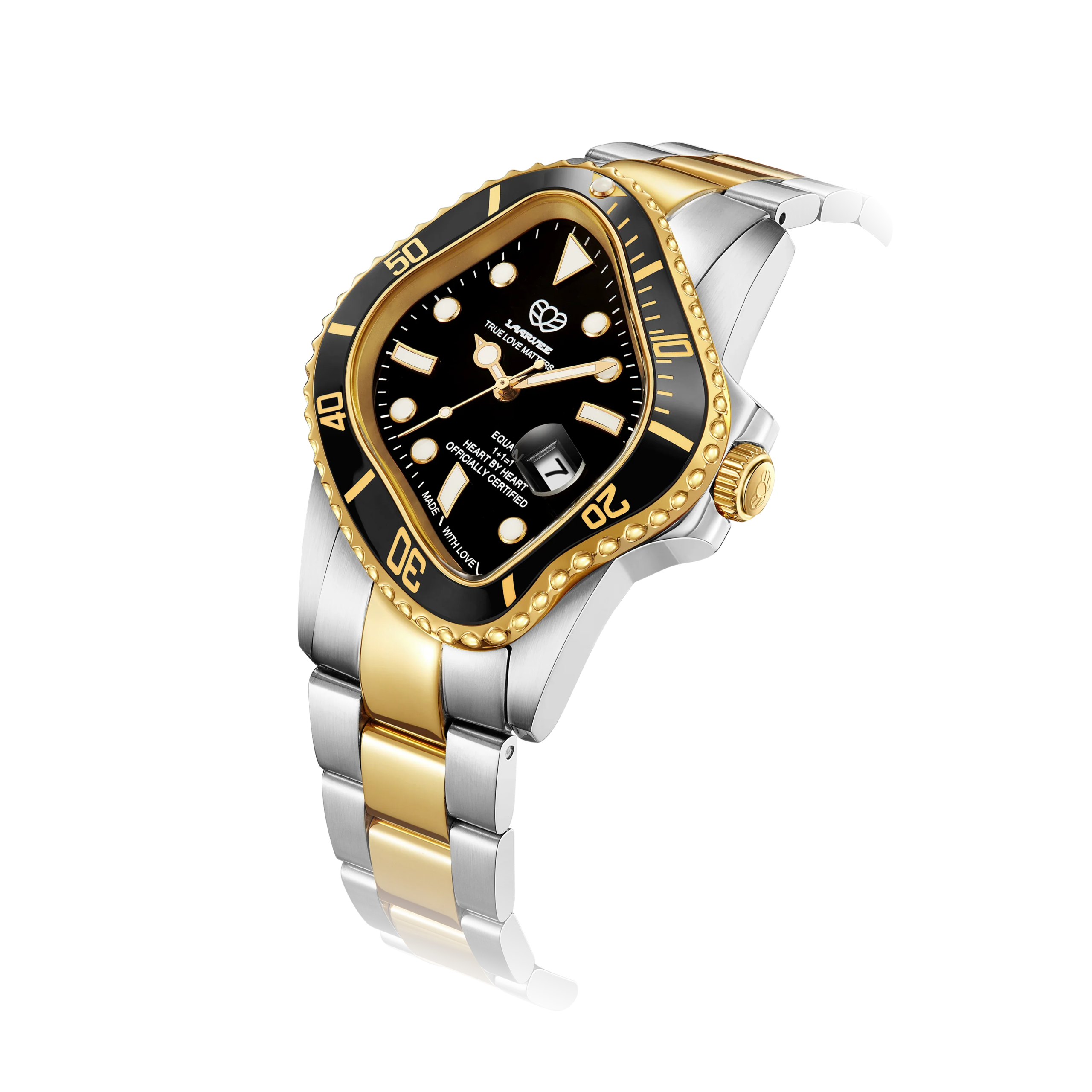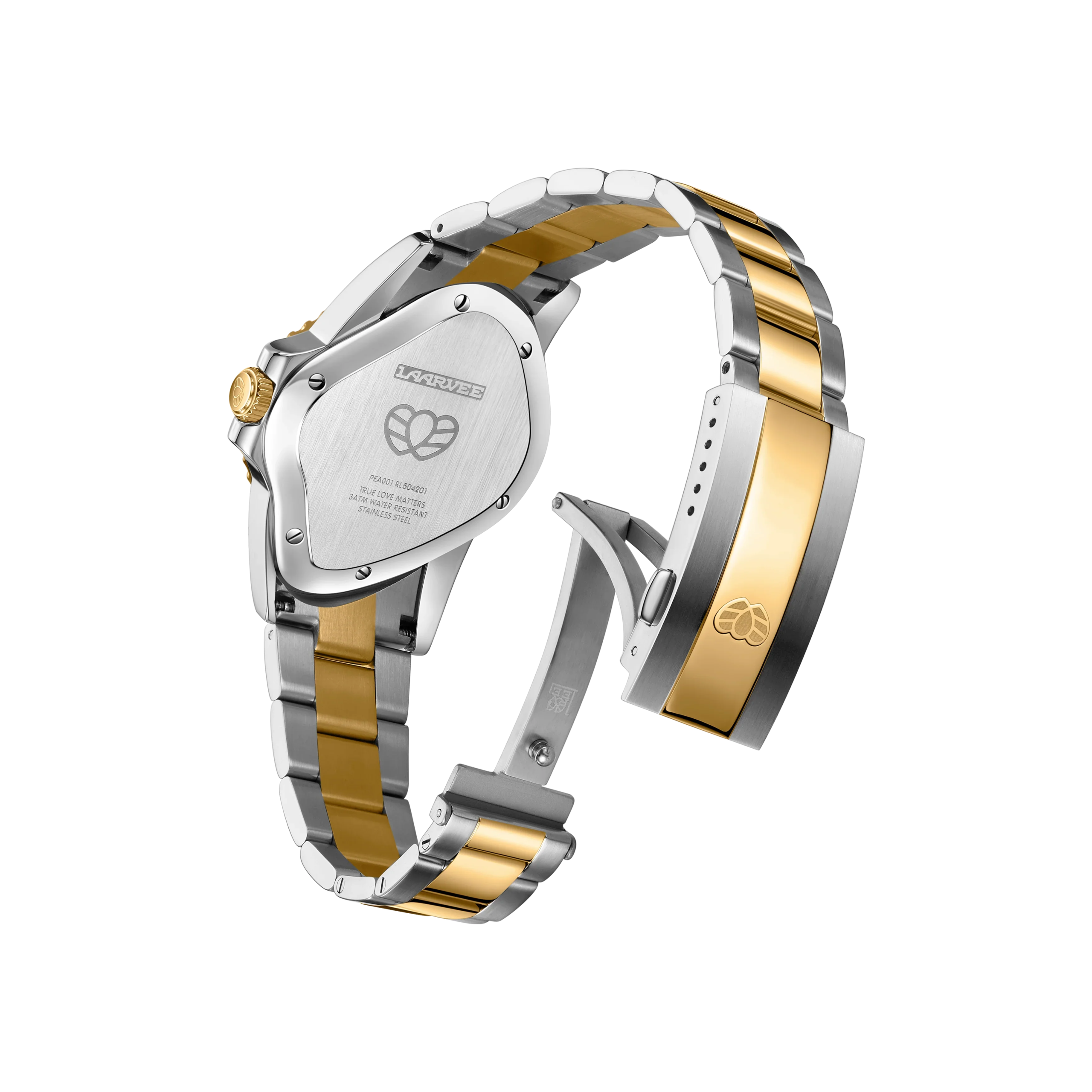 PEA001-SGBLK, 43×45 mm boyutlarındaki gümüş ve altın renkli hassas çelik kasası ile şık bir görünüm sunar. Siyah seramik bezel ile çevrelenmiş bu saat, Laarvee’nin sürrealist mirasını modern bir estetikle harmanlar.