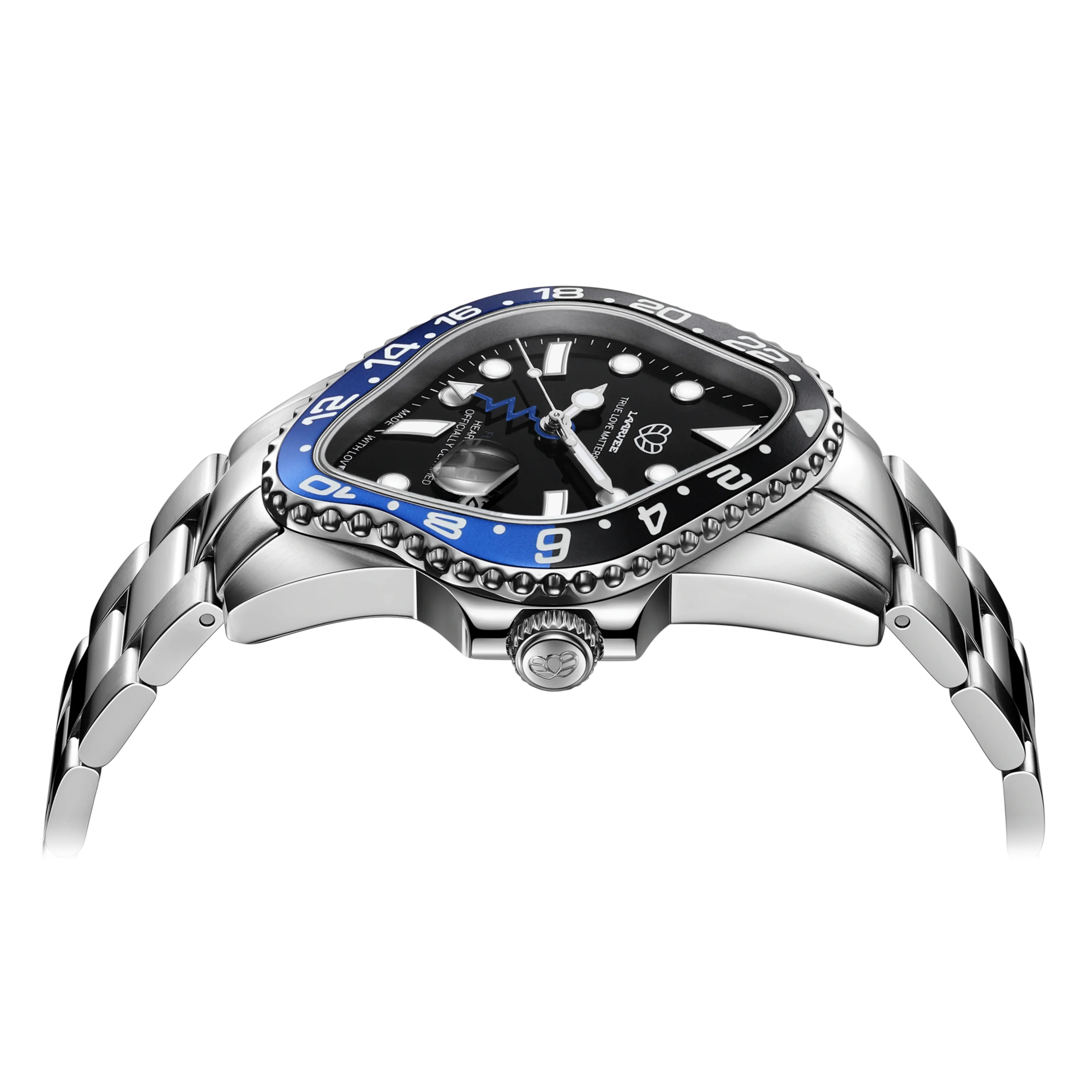 45x40 mm boyutlarındaki paslanmaz çelik kasa, çizilmelere karşı dayanıklı siyah ve mavi seramik bezel ile bir araya gelerek göz alıcı bir kontrast oluşturur. Derin siyah kadran, gümüş trim ile çevrelenmiş olup, lüminescent ibreler ve indeksler ile net bir okunabilirlik sunar.