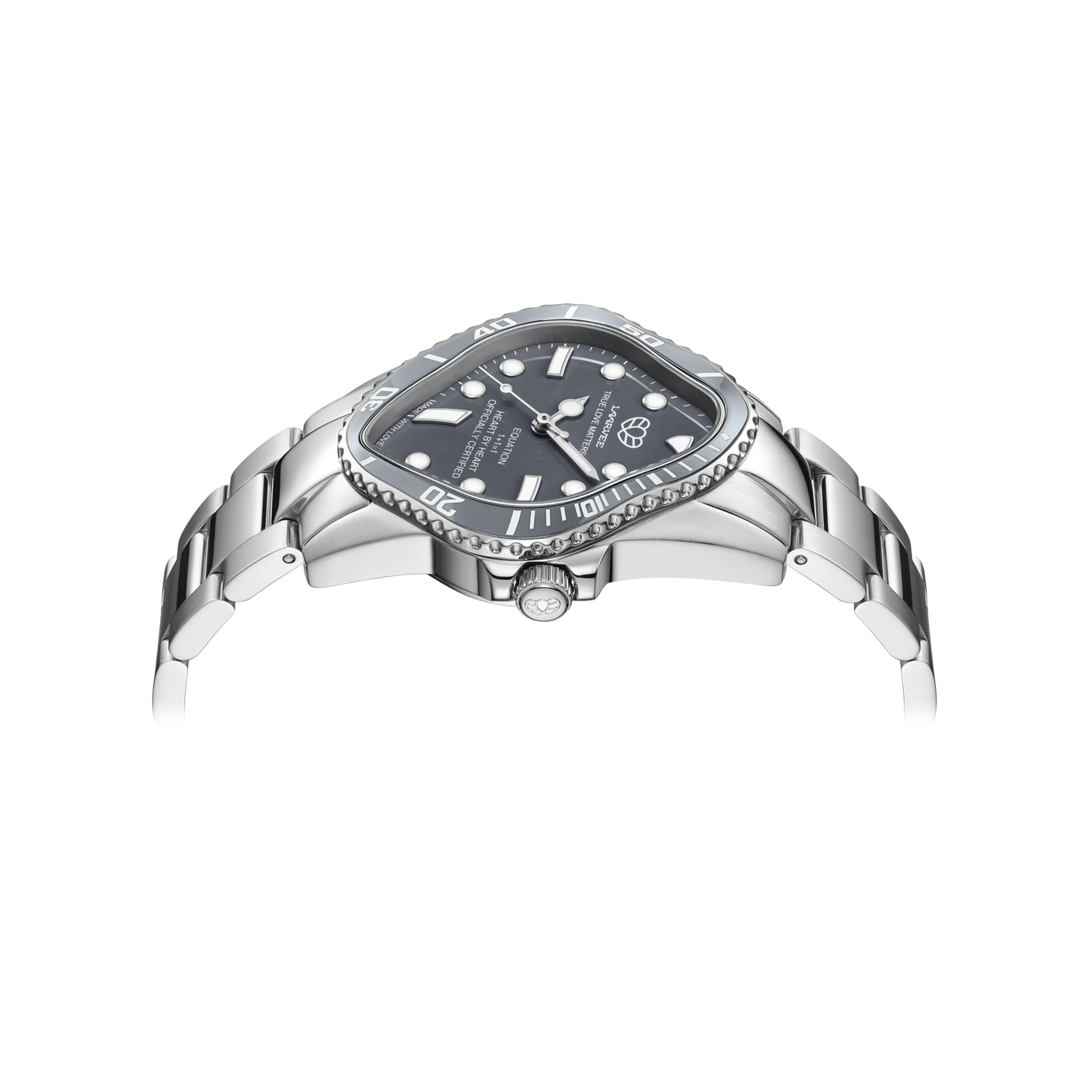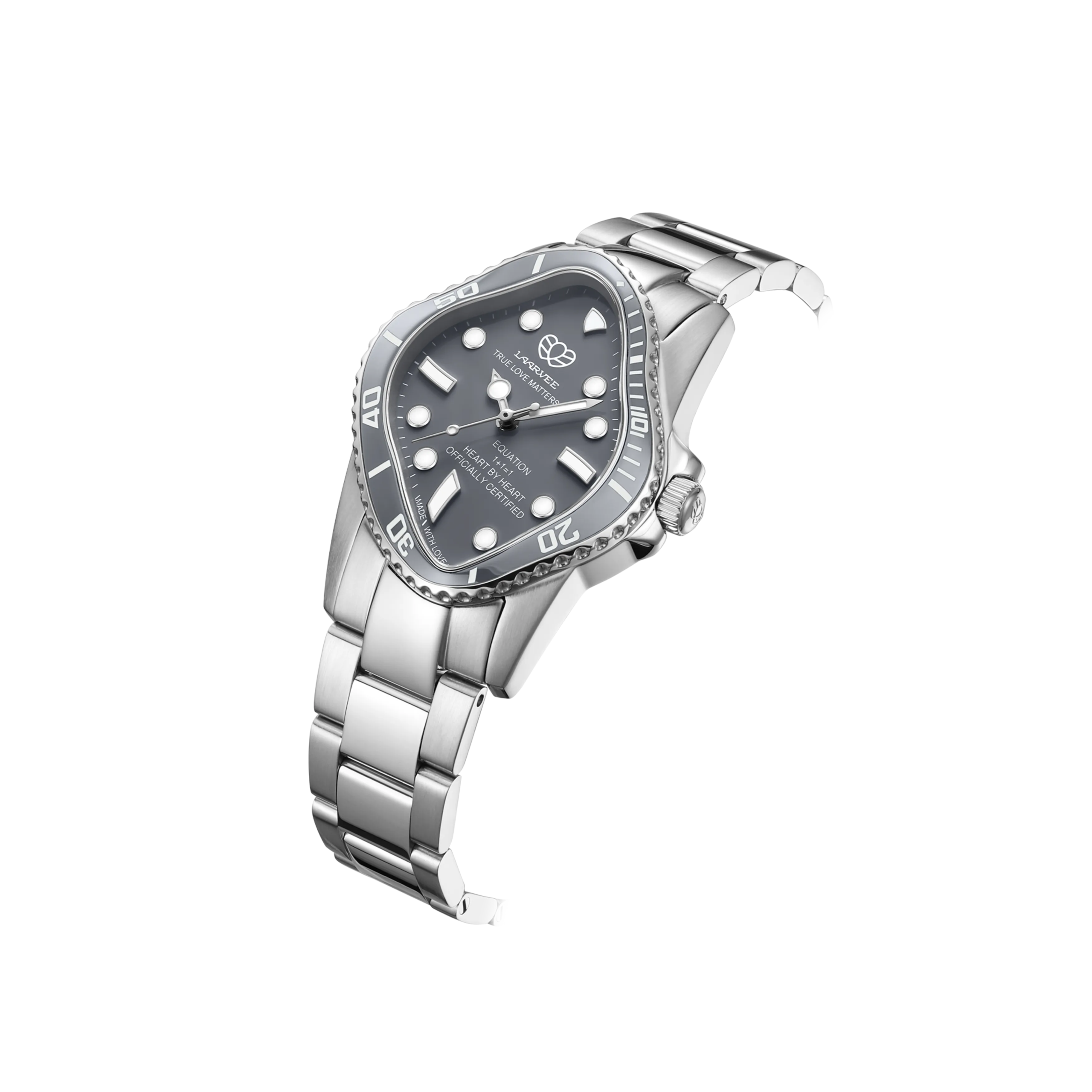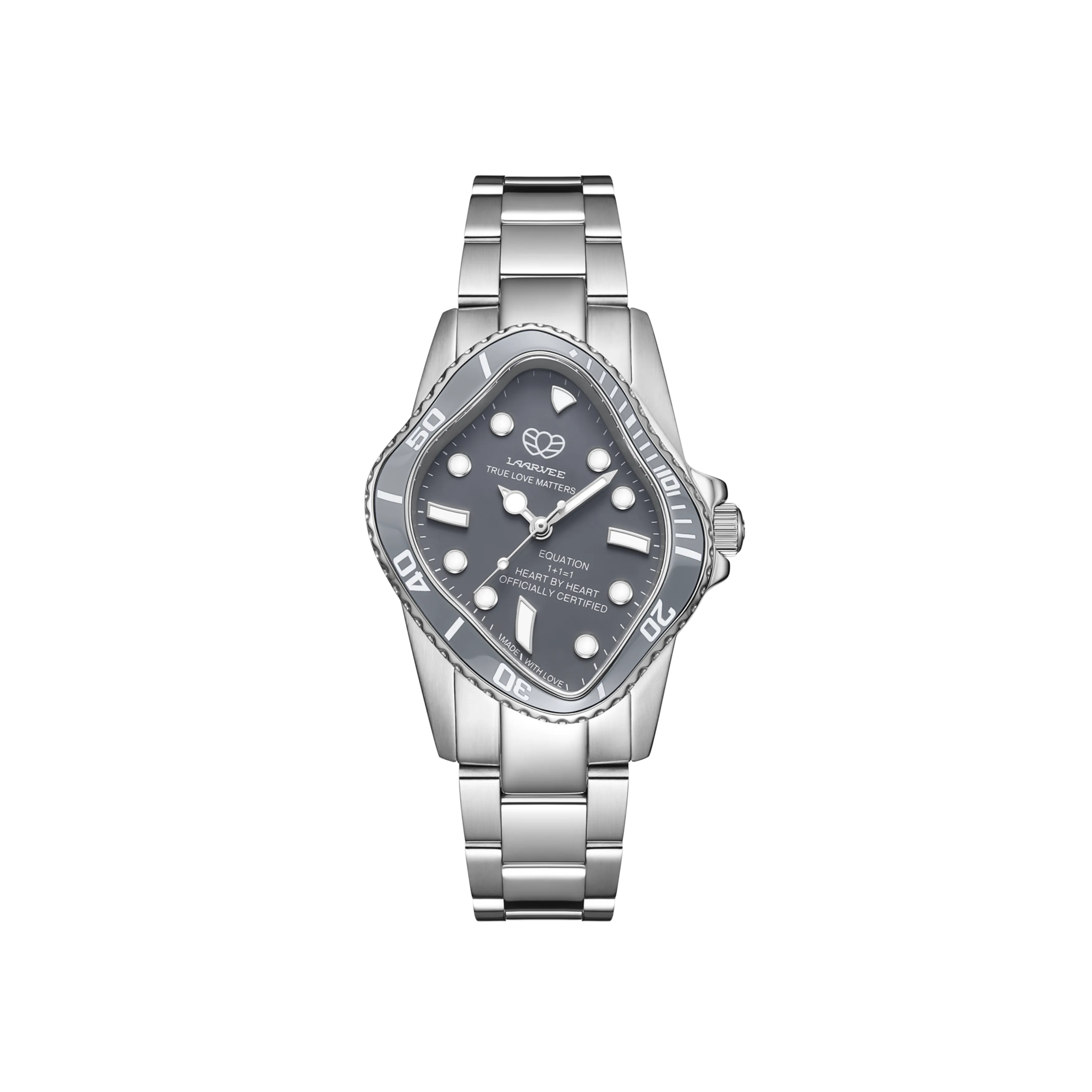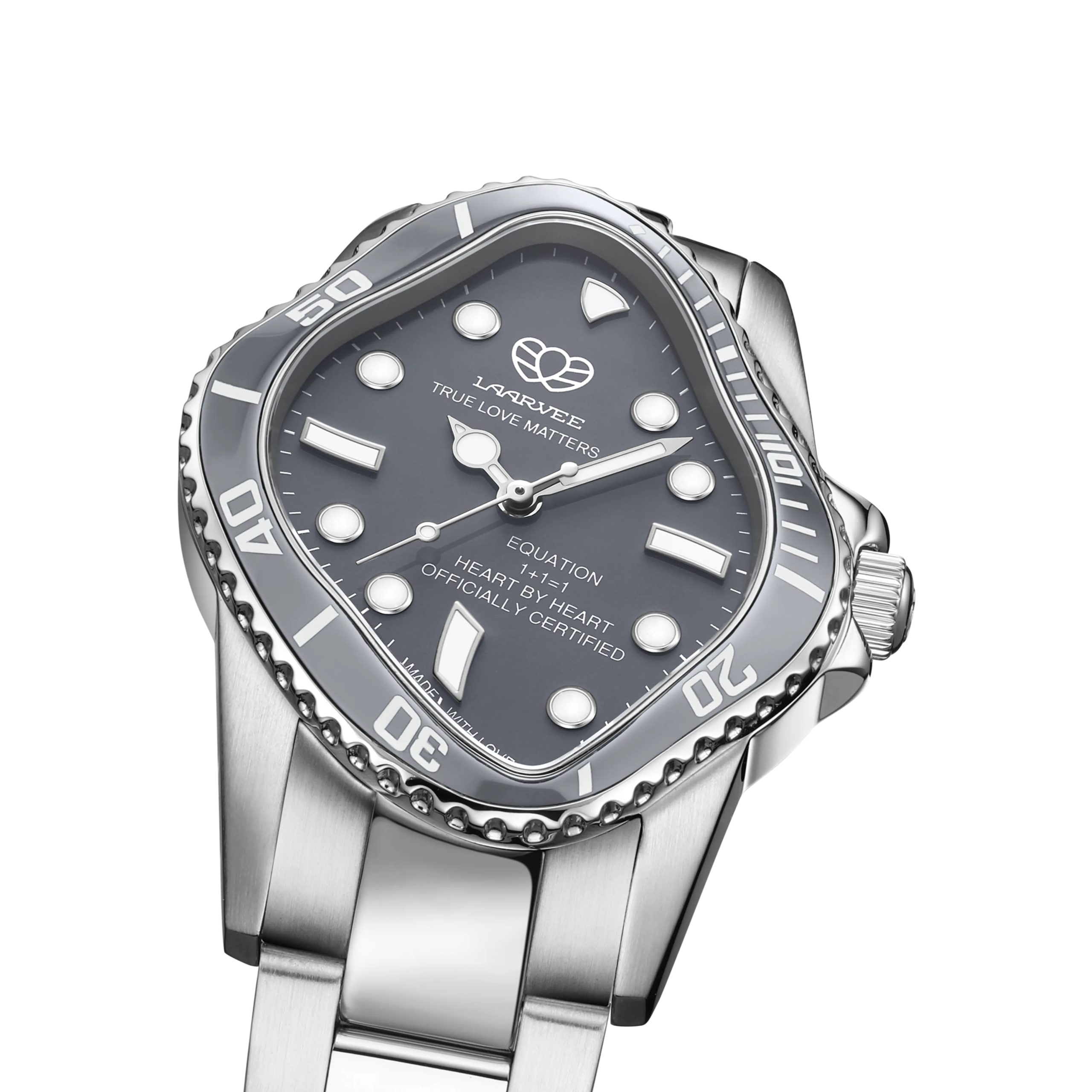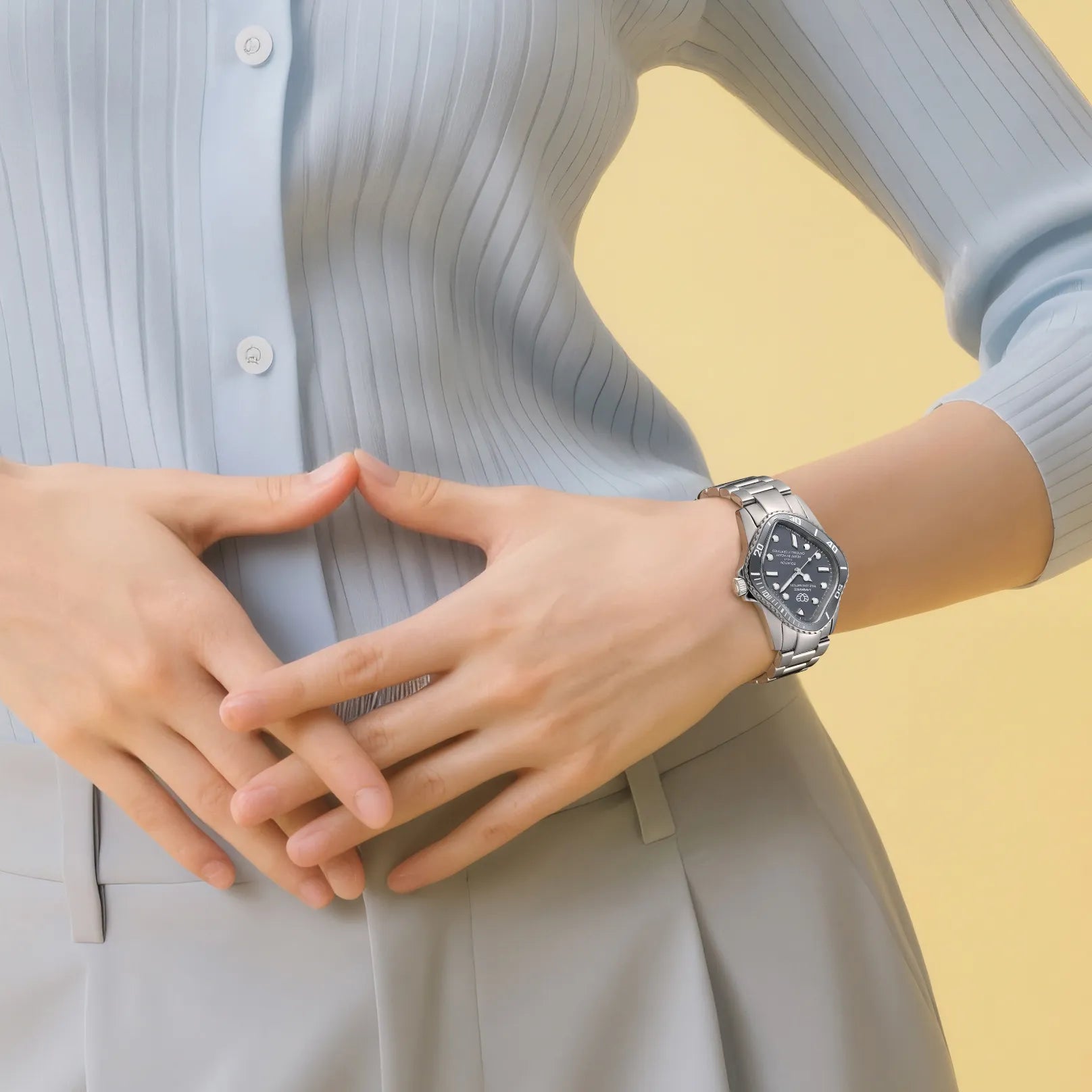 32 × 37 mm boyutlarındaki paslanmaz çelik kasa, fırçalanmış yüzeyiyle minimalist saatlerin en iyi örneklerini yansıtır. Mat gri kadran, siyah seramik bezel ile çerçevelenerek hem kontrast hem de çizilmelere karşı dayanıklılık sağlar.