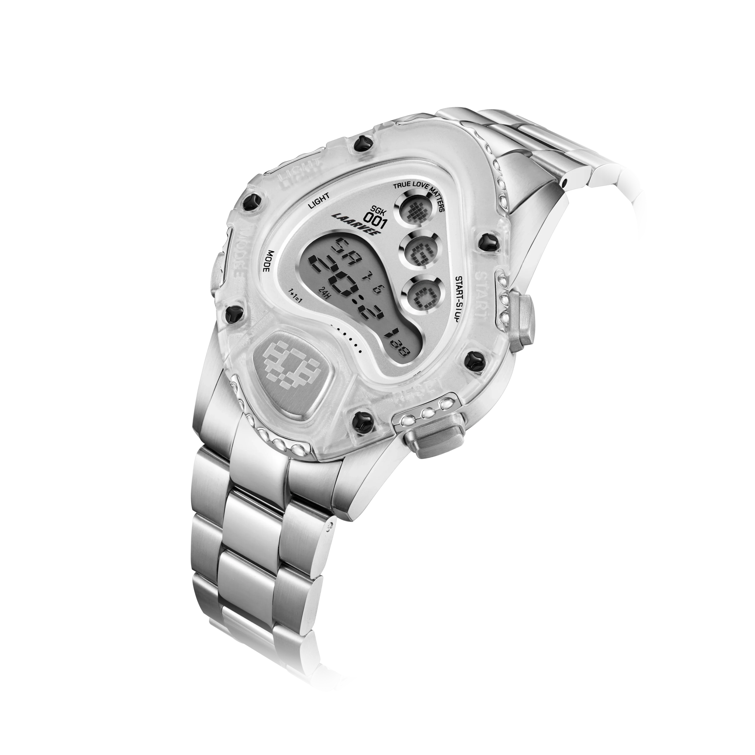 Laarvee'nin imza tarzıyla tasarlanan SGK001R-PBTRWHTSVR, bozulmuş LCD ekranı ile dijital hassasiyeti heykelsi formla birleştiriyor. Bu dijital saat, geleneksel saat yapımı ile çağdaş sanatı bir araya getirerek yeni bir dönemi başlatıyor.