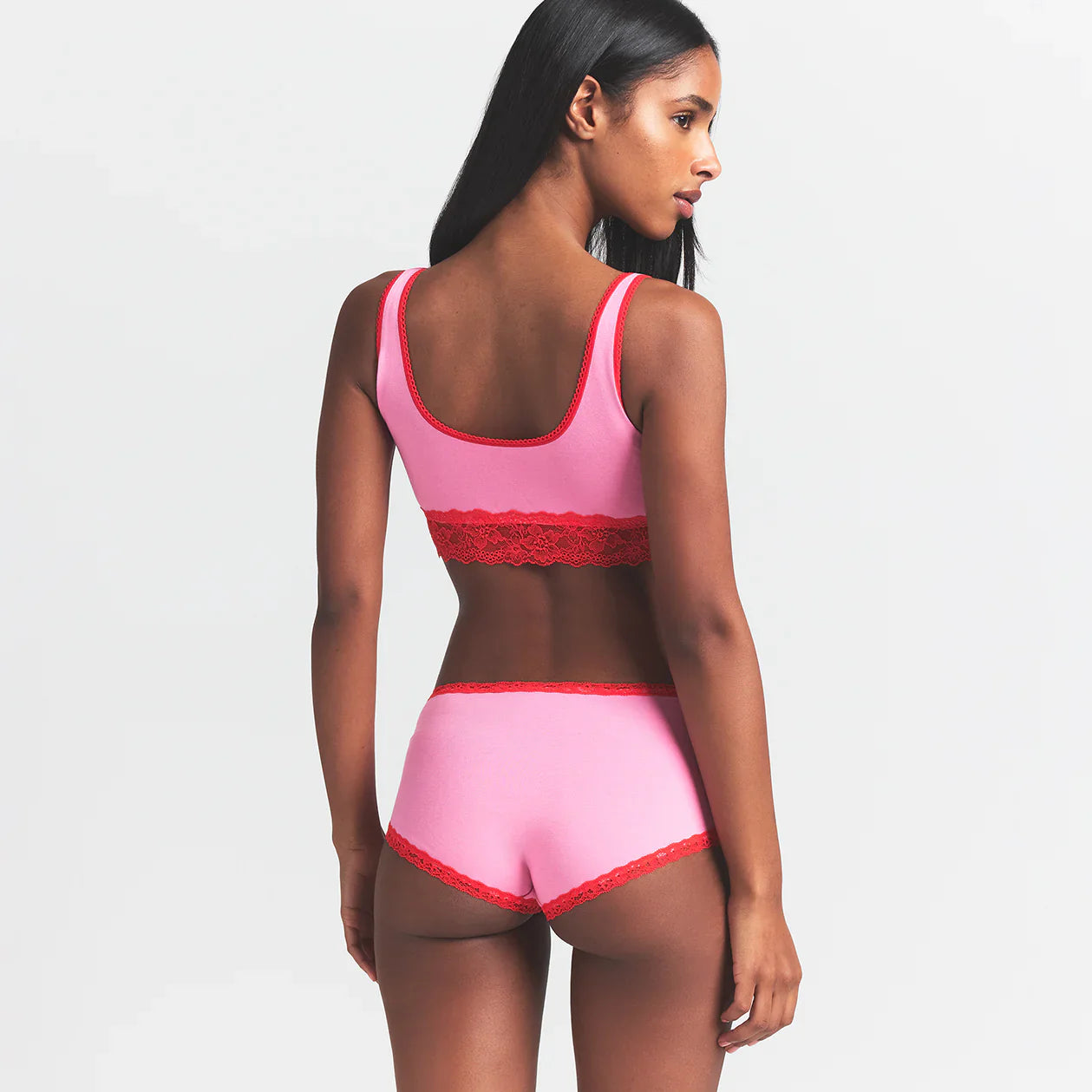 SKIMS LIGHTWEIGHT COTTON LACE BOY SHORT | CARNATION CONTRAST