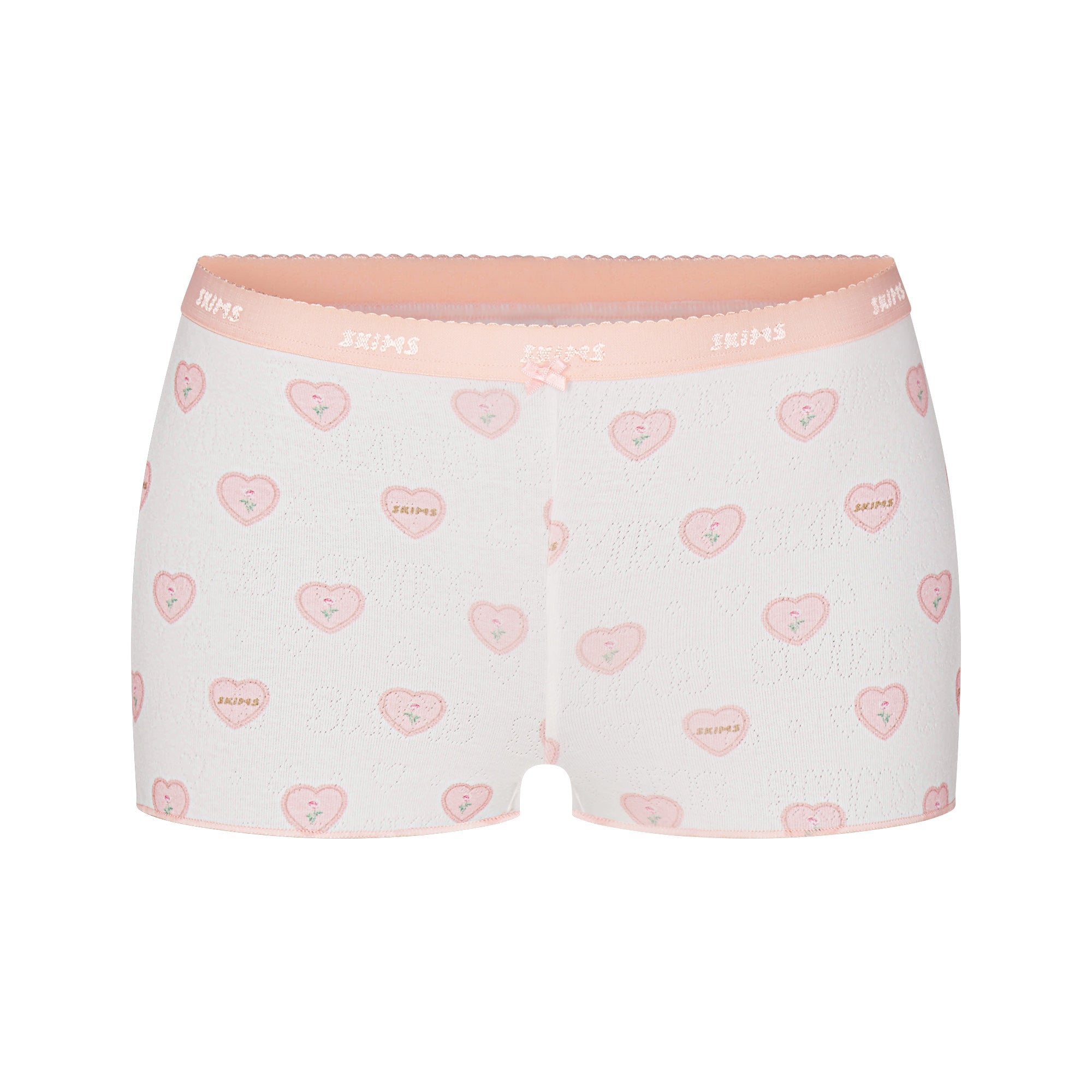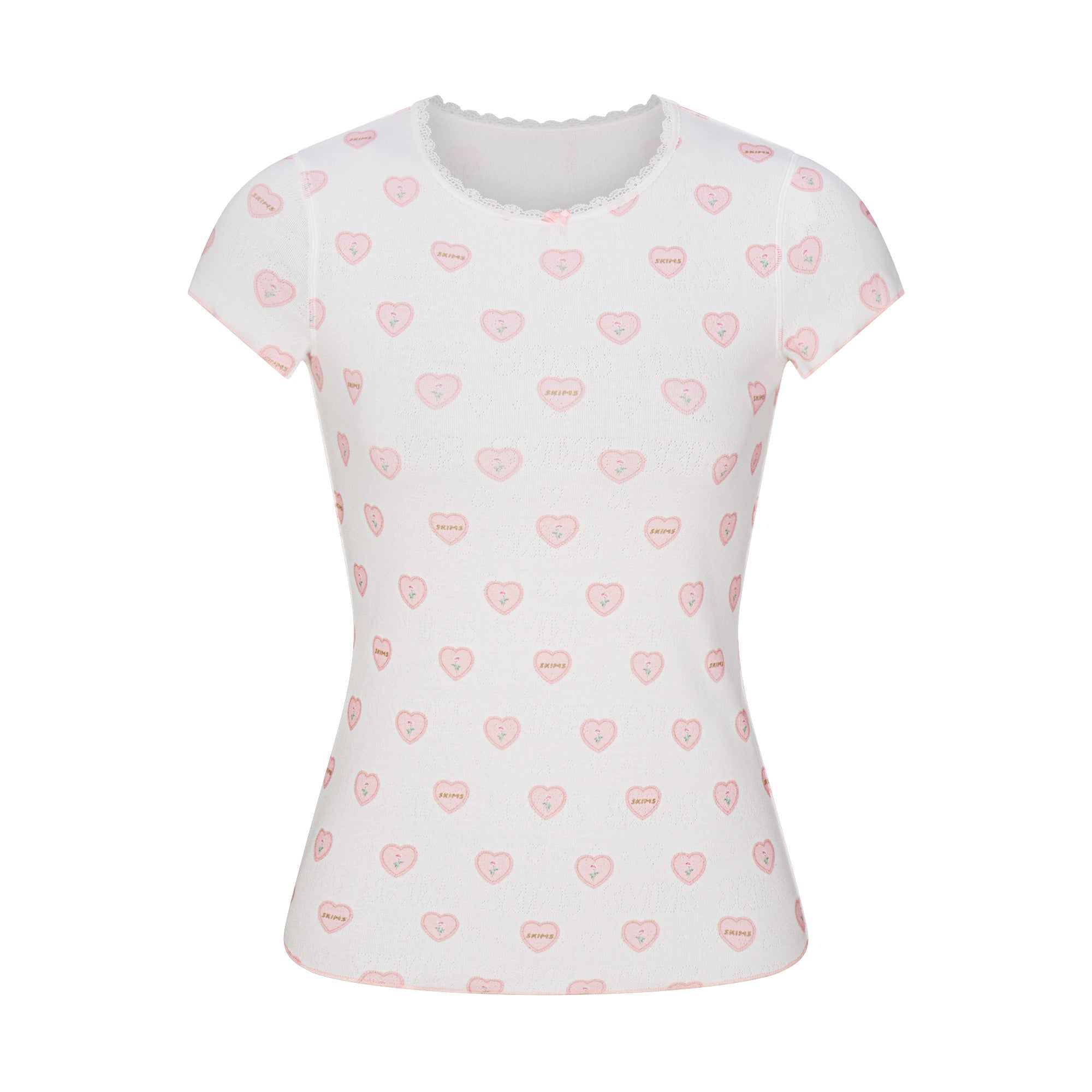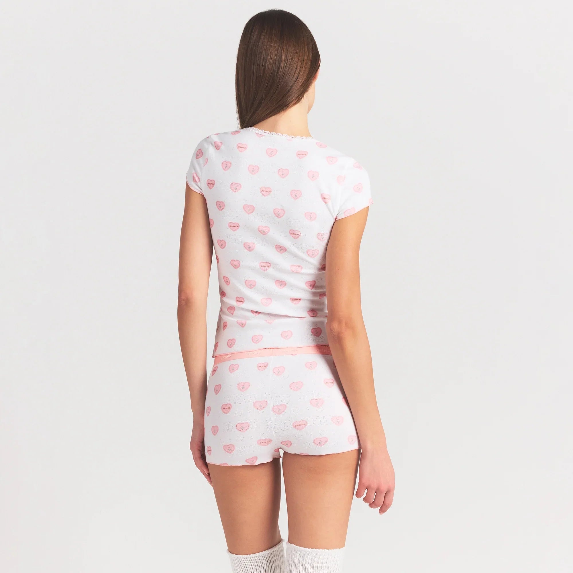 SKIMS LOGO POINTELLE BABY TEE AND MICRO SHORT SET | SNOW LACE HEARTS