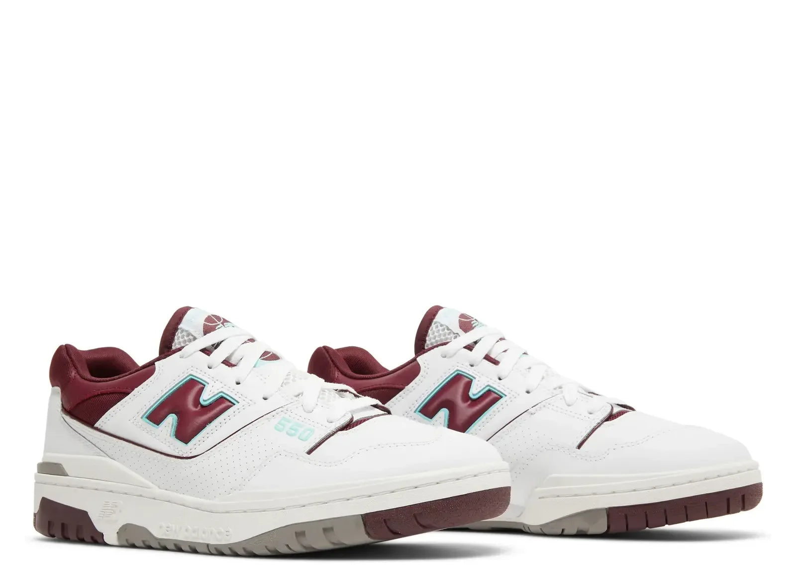 New Balance 550, delikli yüzeylerle zenginleştirilmiş tasarımı ve bordo kanvas yakaları ile estetik bir denge sunmaktadır. Camgöbeği süslemeler, ayakkabının modern görünümünü tamamlayarak özgün bir stil yaratmaktadır.