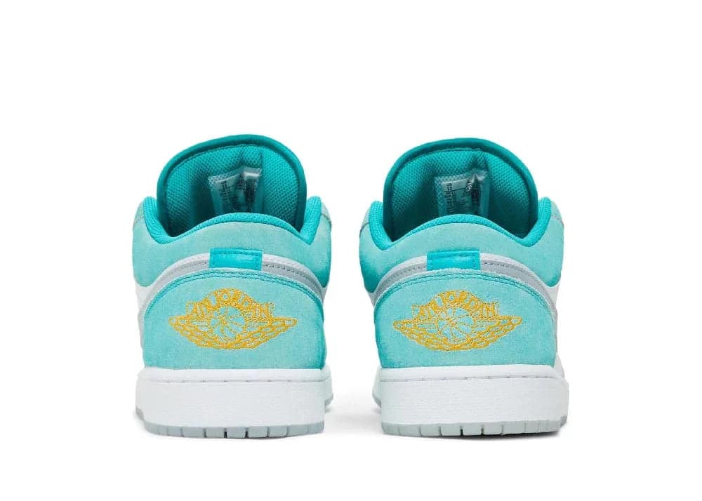 Nike Air Jordan 1 Low SE New Emerald, açık yeşil ve altın vurgularla zenginleştirilmiş bir tasarıma sahiptir. Bağcıkları, yakası, burnu ve topuğu parlak beyaz süet ile kaplanmış, bu da estetik bir denge sağlıyor. Deri dış tabanı, şıklığı ve dayanıklılığı bir arada sunarak bu modeli öne çıkarıyor.