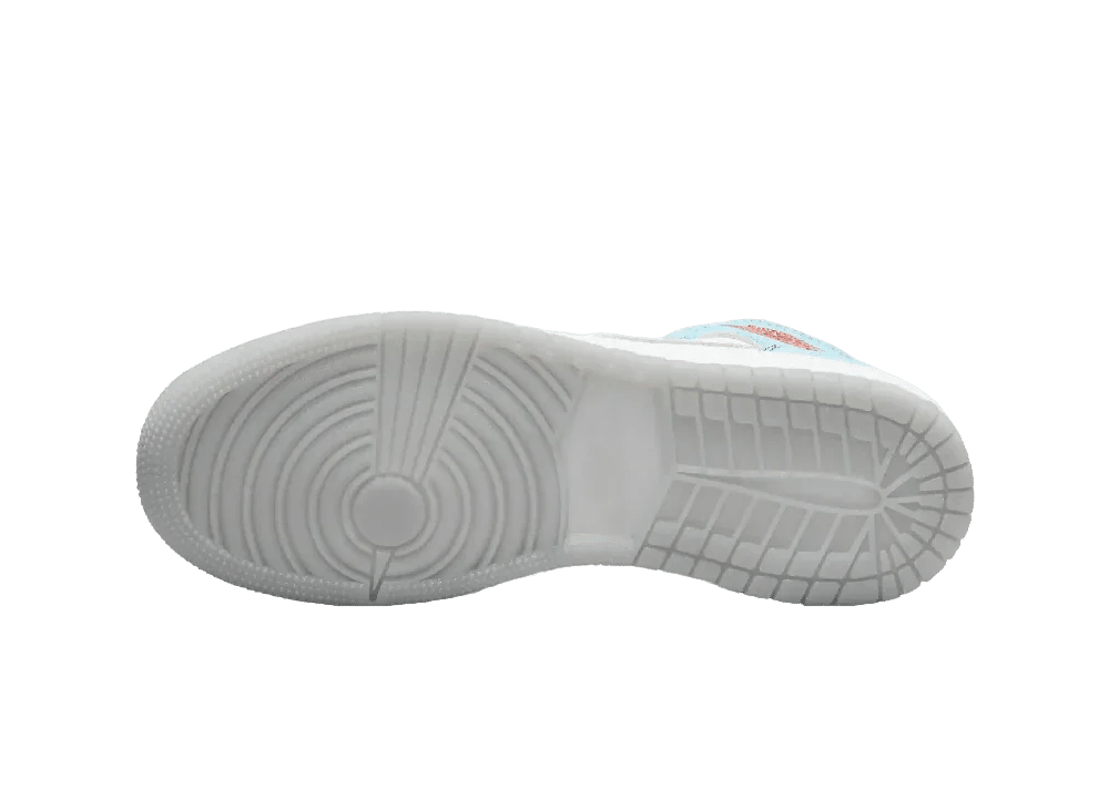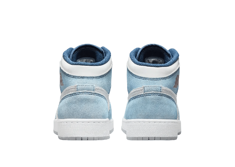 Nike Air Jordan 1 Mid SE French Blue Light Steel (GS), eşsiz tasarımıyla dikkat çeken bir spor ayakkabıdır. Soluk mavi süet yüzeyler, beyaz deri üst kısım ile birleşerek yıpranmış bir görünüm sunar.