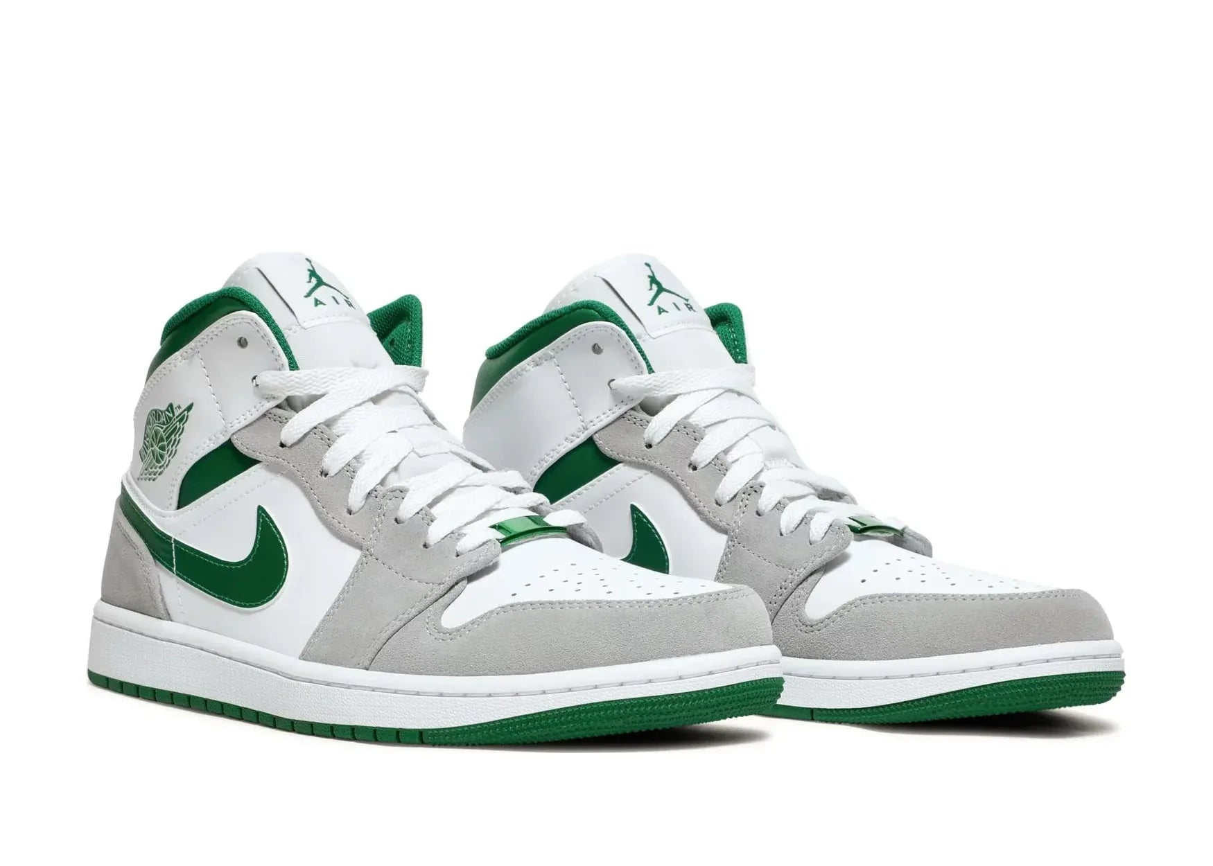 Jordan 1 Mid Grey Green, beyaz deri sayasıyla zarif bir görünüm sunarken, gri Durabuck yüzeyler ve metalik yeşil Swoosh'larla estetik bir denge oluşturur. Metalik yeşil dantel etiketi ve yakadaki özel Wings logosu, tasarımı tamamlayarak özgün bir hava katmaktadır.