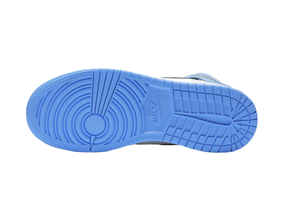 Nike Air Jordan 1 Retro High, burun kısmındaki delikler ve eskitme beyaz derisi ile zarif bir görünüm sergiliyor. University Blue süet kaplamalar, ayakkabının genel estetiğini tamamlayarak şık bir kontrast oluşturuyor. Siyah detaylar ise tasarıma dinamik bir hava katıyor.