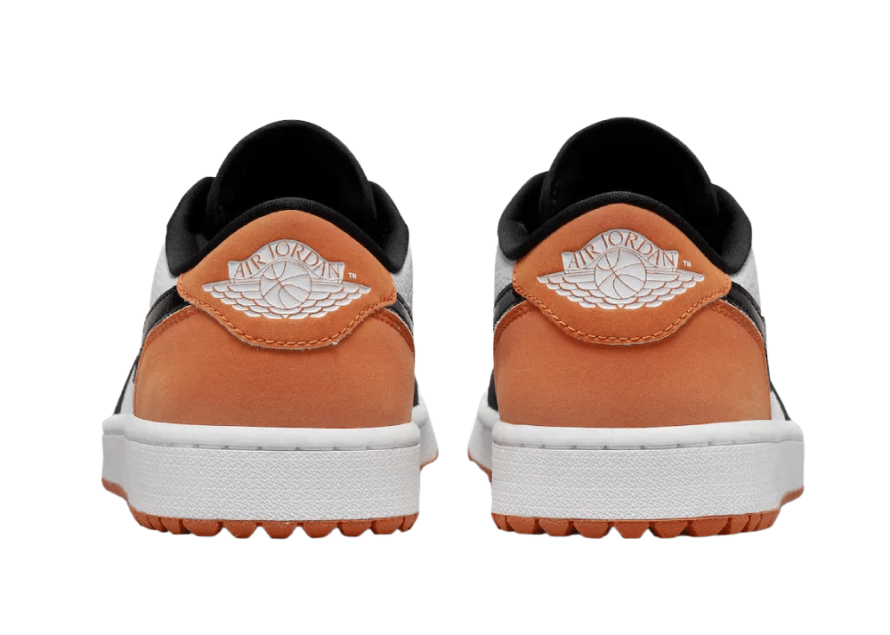 Nike Air Jordan 1 Retro Low Golf Shattered Backboard, eskitme deri panelleri ve şık siyah yüzeyleriyle dikkat çeker. Kontrast oluşturan beyaz çakıllı deri yan paneli, ayakkabının genel estetiğine zarif bir dokunuş katar. Mandalina rengi detaylar, tasarımın dinamik ve enerjik bir görünüm kazanmasını sağlar.