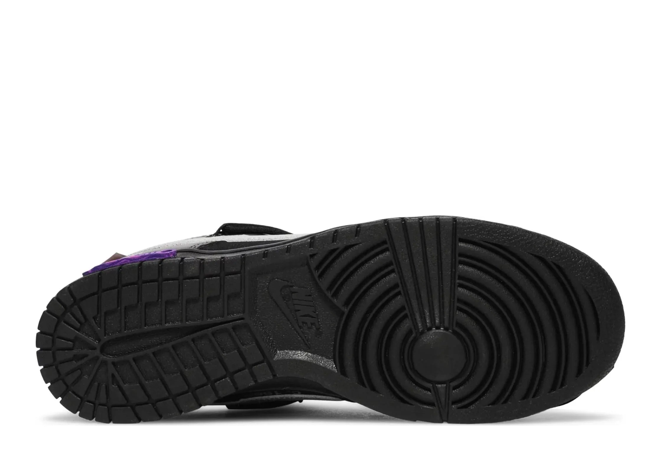 Nike Dunk Low Off-White Lot 50, pürüzsüz siyah deri yüzeyler ve gümüş Swoosh’larla zarif bir görünüm sunuyor. Mor "Parti 50/50" plakalı siyah tabanlar, tasarımın dinamikliğini artırırken, detaylardaki mor ayrıntılar estetik bir denge sağlıyor.