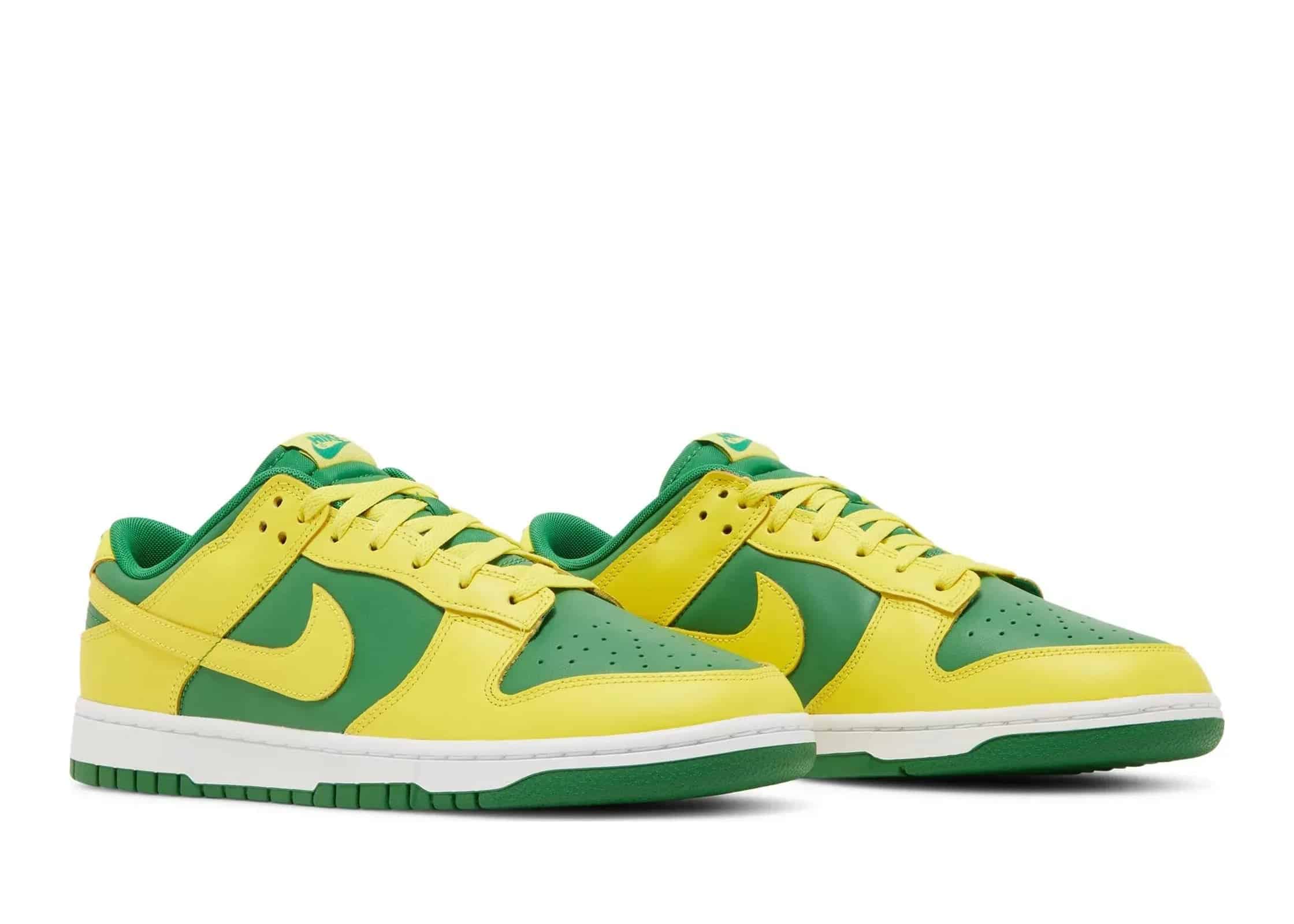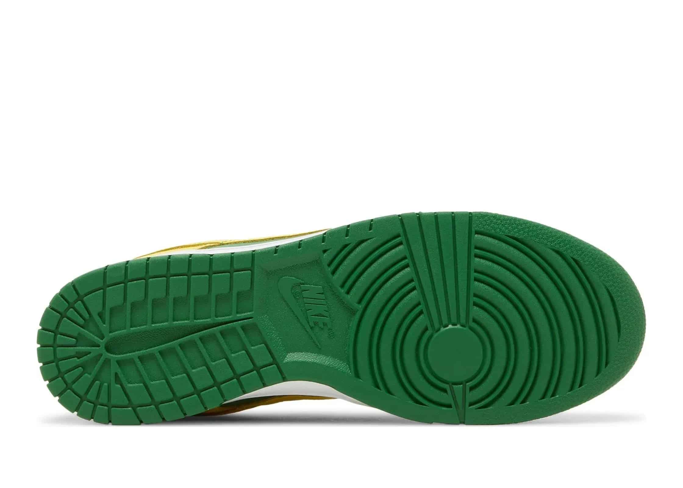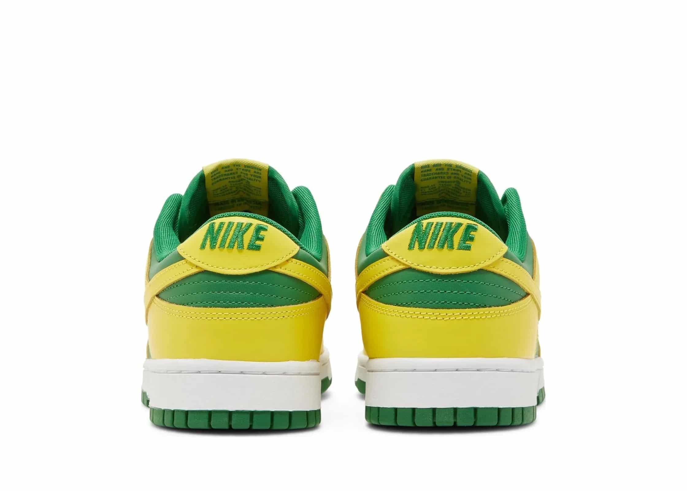 Nike Dunk Low Retro Reverse Brazil, üst kısmında sarı ve yeşil renk bloklarıyla dikkat çekerken, beyaz orta tabanı ile estetik bir denge sağlıyor. Dış tabandaki yeşil detaylar ve sarı bağcıklar, genel tasarıma dinamizm katıyor.