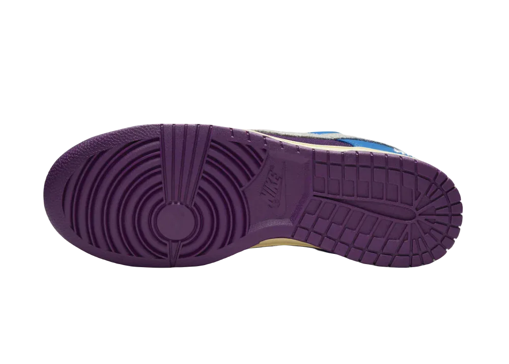 Nike Dunk Low Undefeated 5 On It, yılan baskılı yüzeyi ve mor kanvas çeyrek panelleri ile dikkat çekici bir estetik sunuyor. Kaliteli mavi deri üst kısım, zarif beyaz süet Swoosh'lar ile tamamlanarak şıklığı artırıyor. Topuktaki Undefeated logoları ve dokuma dil etiketi, bu ayakkabının tasarımına son dokunuşu yapıyor.