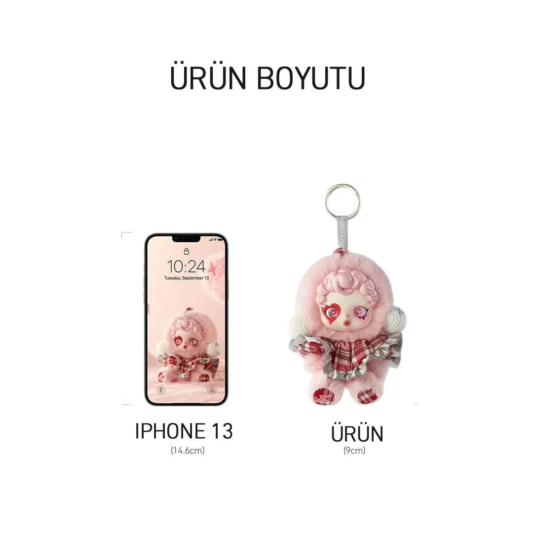 SKULLPANDA, kar taneleriyle bezenmiş pofuduk kostümü ve hafif punk dokusuyla kış sahnesine adım atıyor. Pudra pembesi yanaklar, asimetrik kalp göz makyajı ❤️🔥 ve ekose fırfırlı yaka detayıyla bu minikler; çanta, anahtar ve vitrin raflarınıza soğuk bir mevsim masalı getiriyor.