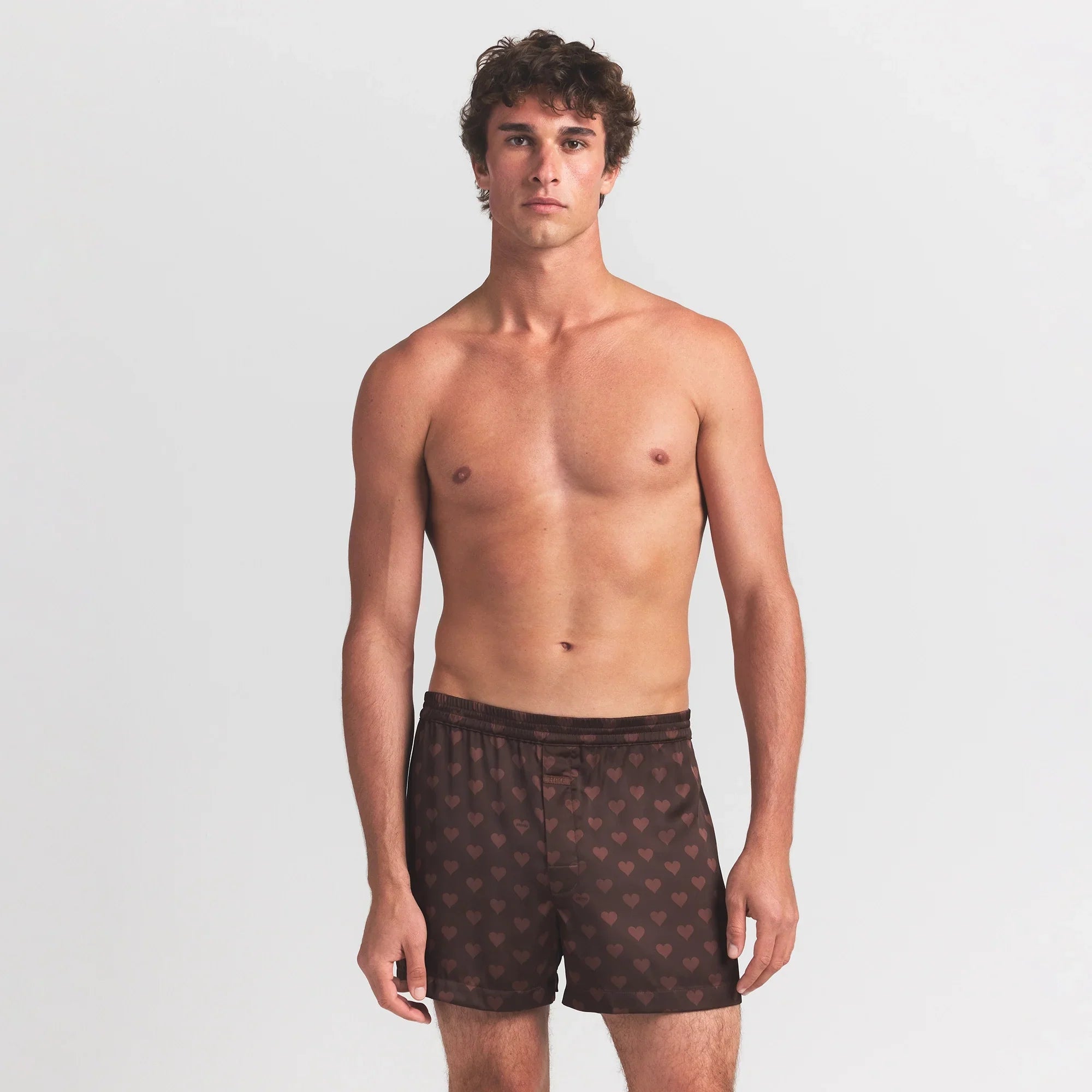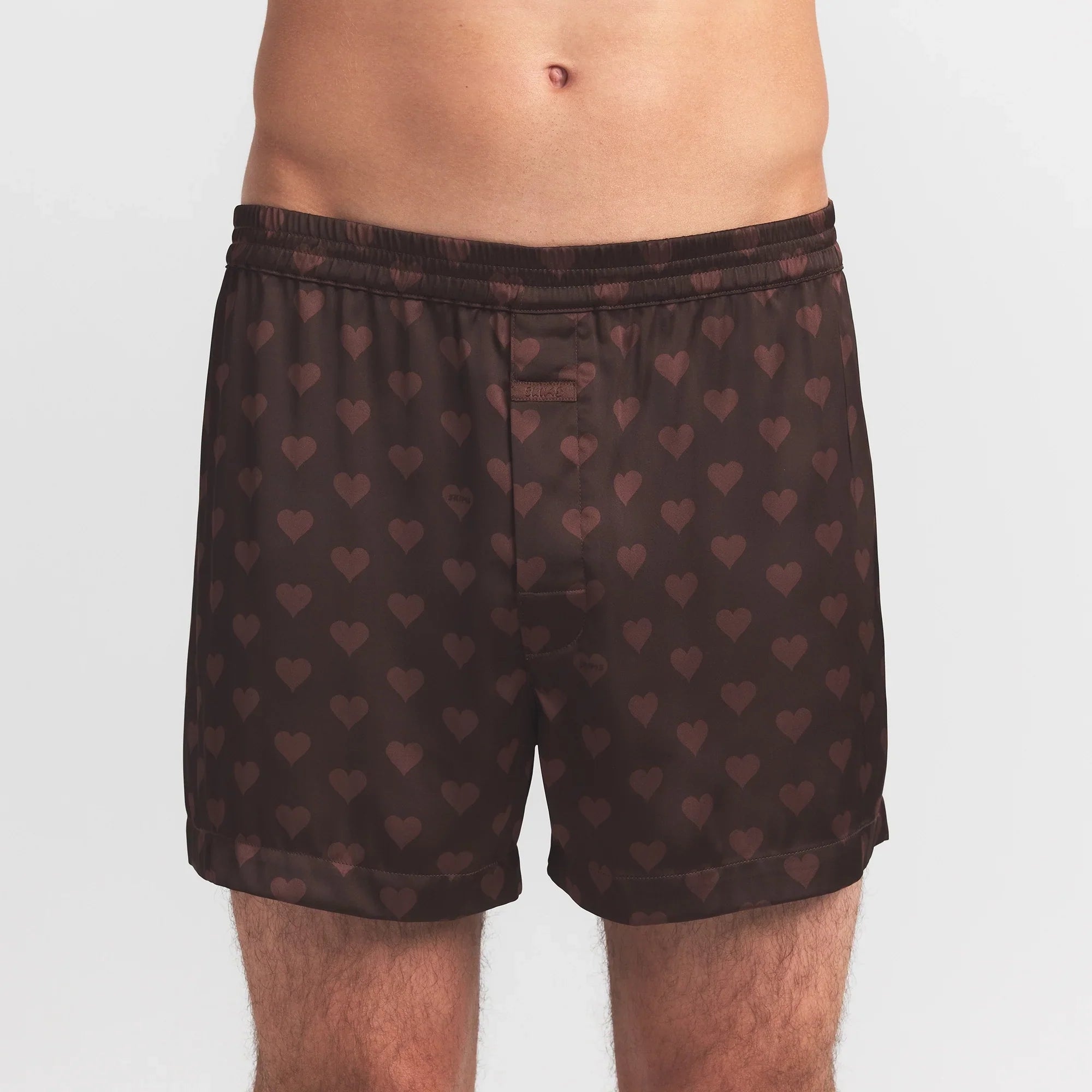 SKIMS SATEEN SLEEP MENS 3″ BOXER SHORT | COCOA HEART HALFDROP