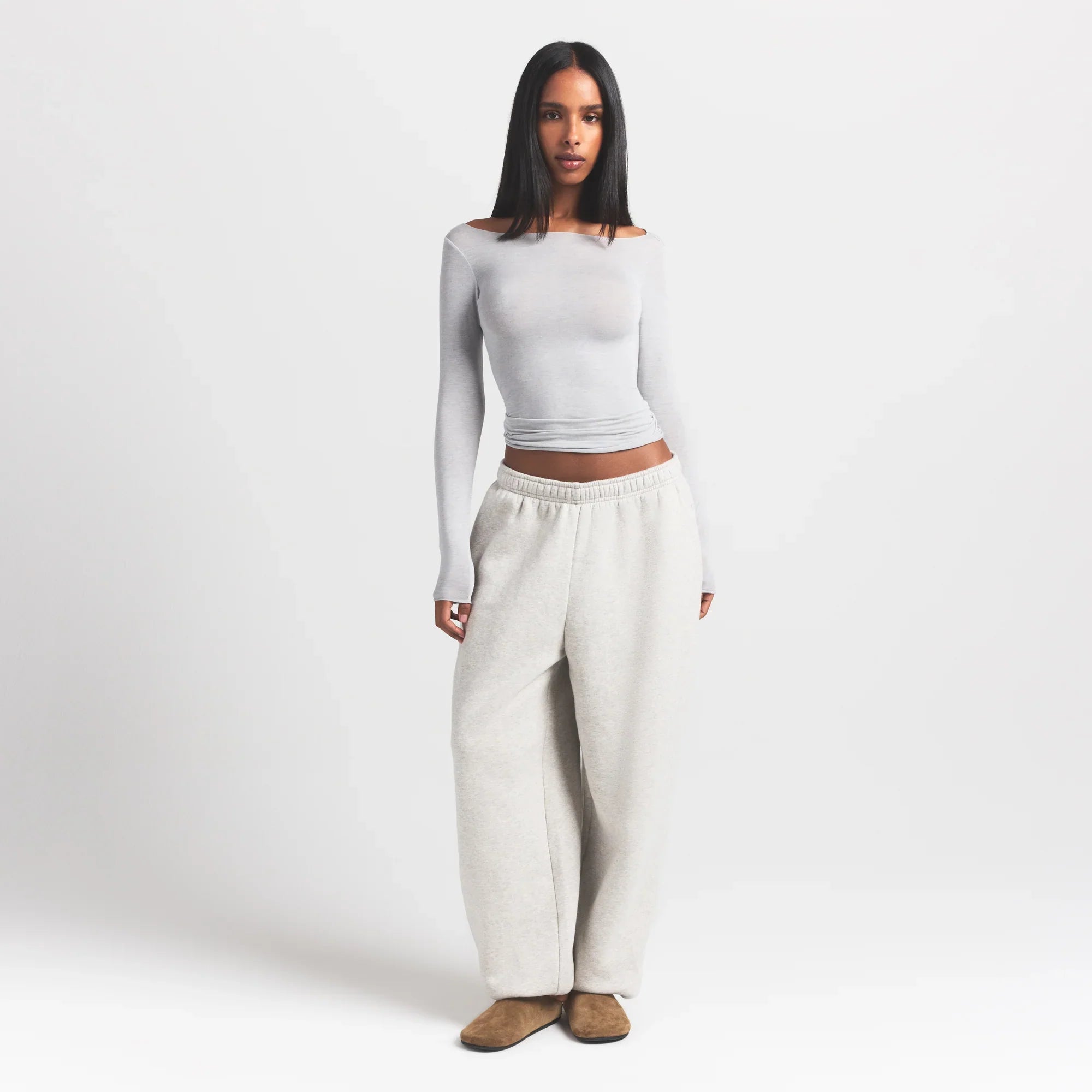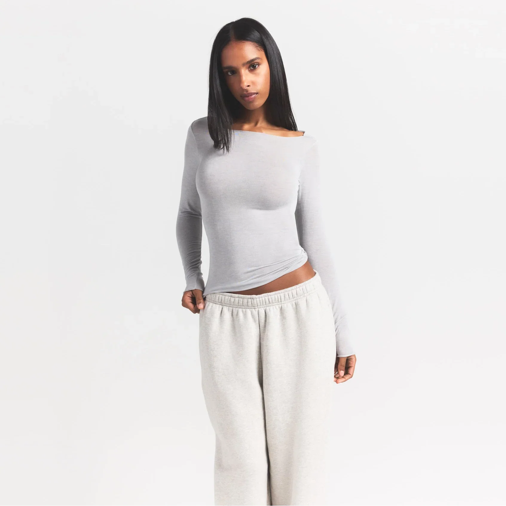 SKIMS SHEER MODAL LONG SLEEVE BOATNECK TOP | HEATHER GREY