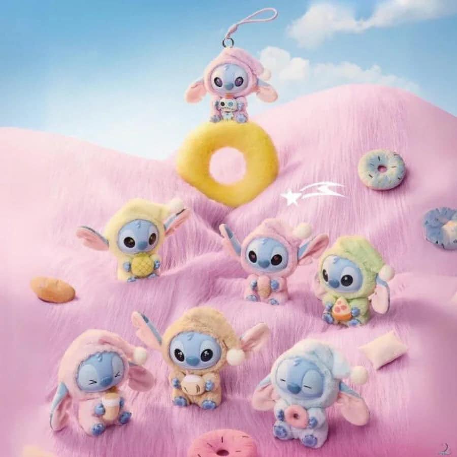 Stitch’in farklı uyku temalı mini figürleri, peluş + vinil malzemenin birleşimiyle üretilmiştir.