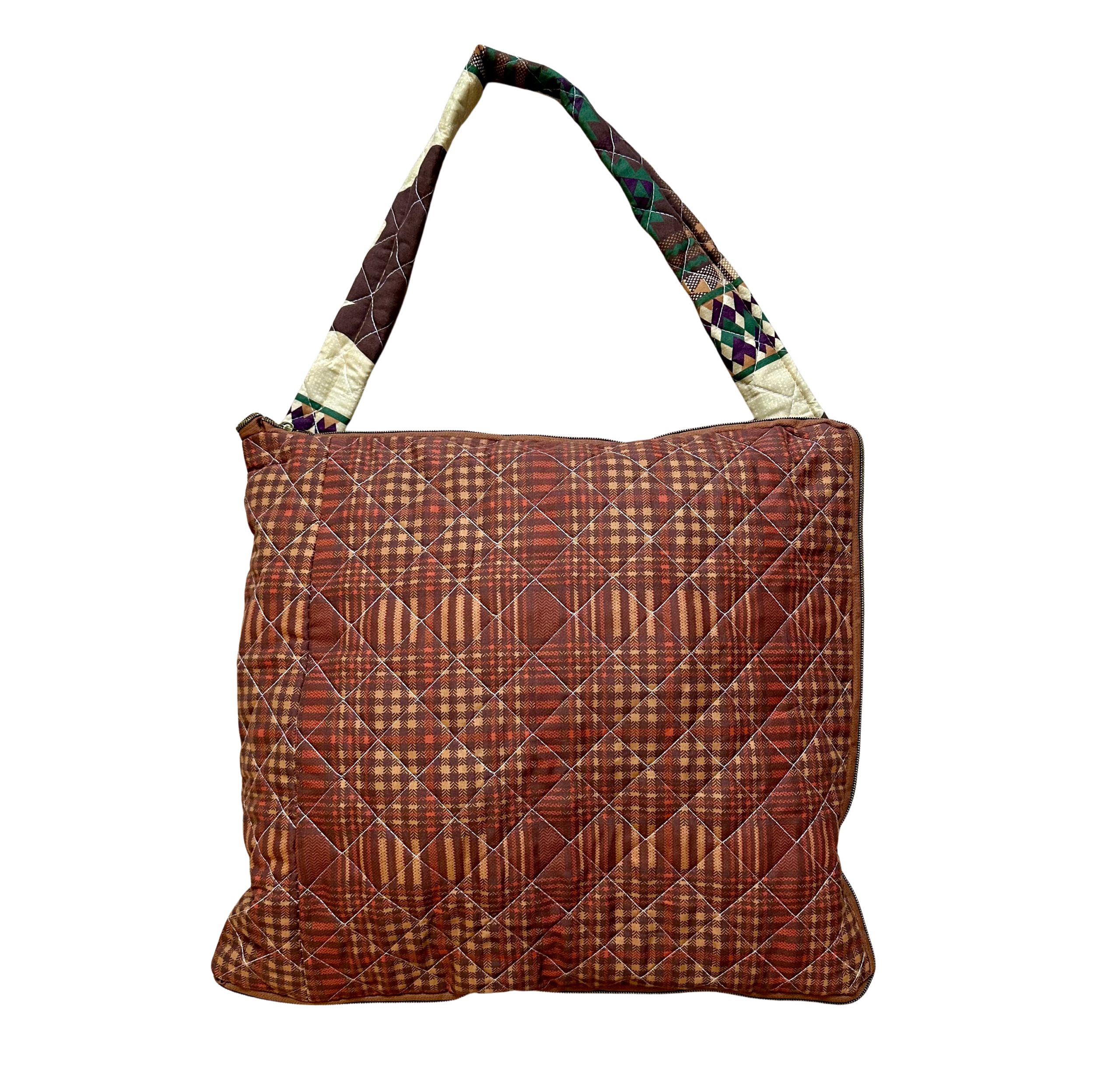 Kumaş; elmas kapitone, patchwork-vari düzen ve geometrik desen işçiliğiyle zengin bir yüzey sunar ve zemininde kahverengi ile pas tonlarını barındırır. Krem, orman yeşili ve mürdüm vurguları parçaya derinlik katar; her bir vintage parça dokusunda ve deseninde benzersiz farklılıklar gösterebilir. El işçiliğini andıran detaylar ve sağlam dikişler, paltonun arşiv niteliğinde duruşunu güçlendirir.