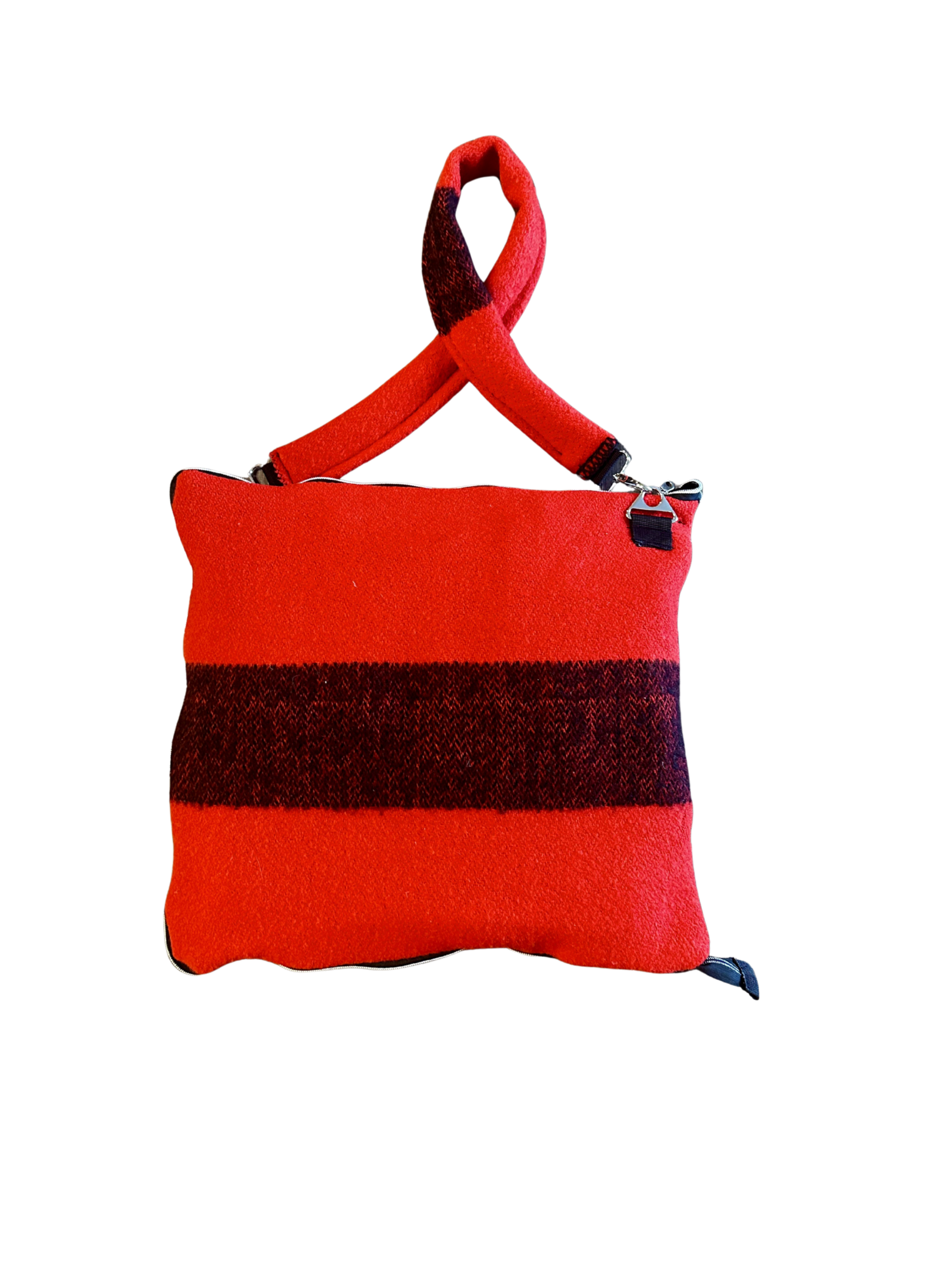Vintage Caribo saf yün battaniyeden inşa edilen Coat N Tote, doygun kırmızı zemin ve klasik Kuzey Amerika kışlık battaniye motiflerinden esinlenen derin yatay bantlarla dikkat çeker. Parça, işlevsel çantaya dönüşüm donanımıyla birleşen miras ve dayanıklılık vurgusuyla benzersiz bir estetik sunar.
