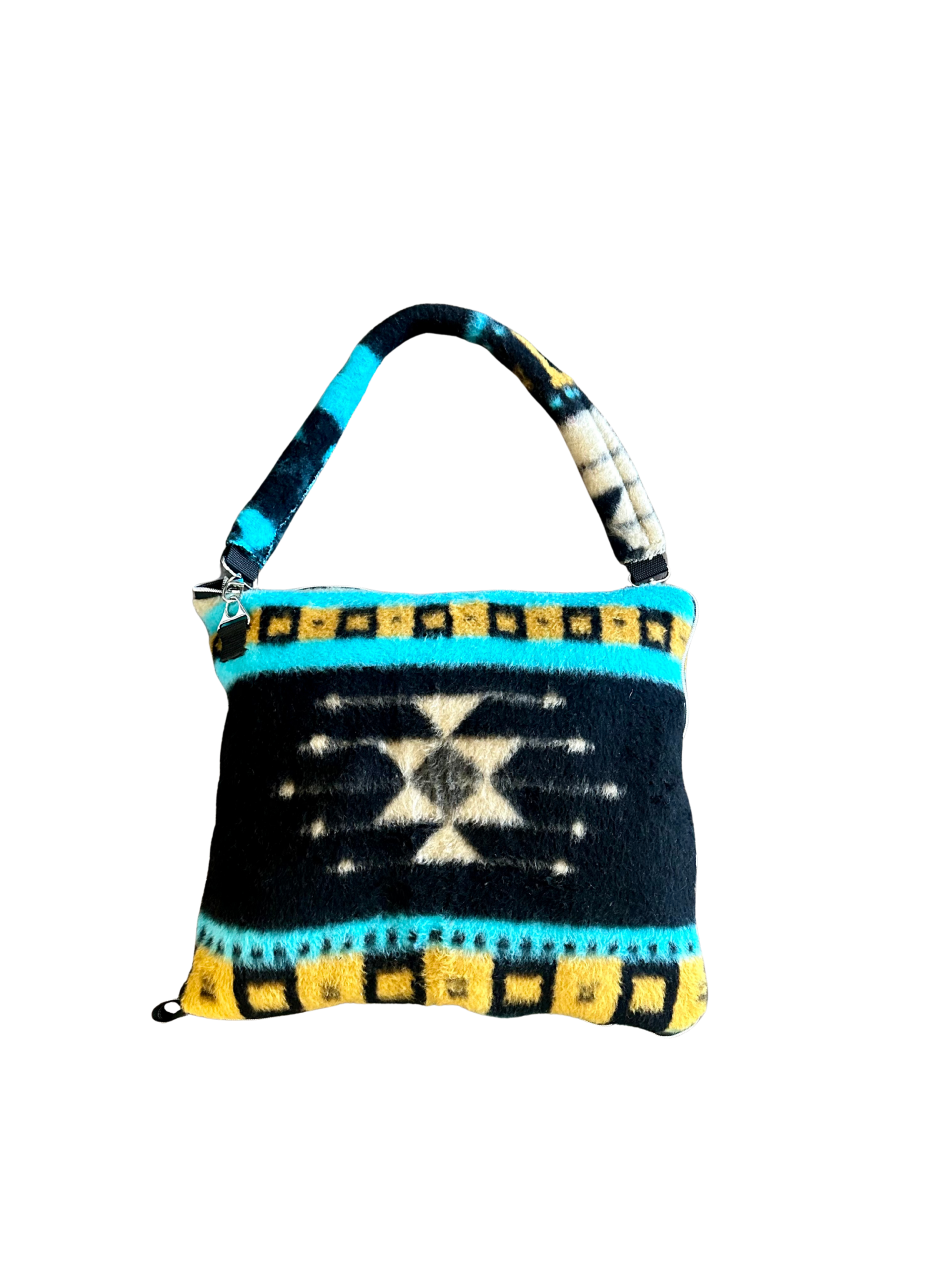 Vintage Amerikan Güneybatısı’ndan ilham alan yün bir battaniyeden üretilmiş Coat n Tote, doygun turkuaz zemin ve cesur geometrik motiflerle dikkat çeker. Parça, titizlikle seçilmiş vintage kumaşlar ve markamızın özenli üretim yaklaşımıyla hayat bulur.